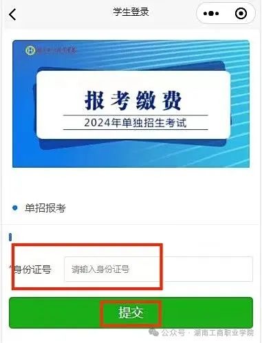 考生凭身份证号码进入“湖南工商职业学院”公众号在“单招报考缴费”通道进行缴费。注:须在3月13日18:00前缴费,否则视为自动放弃考试资格。