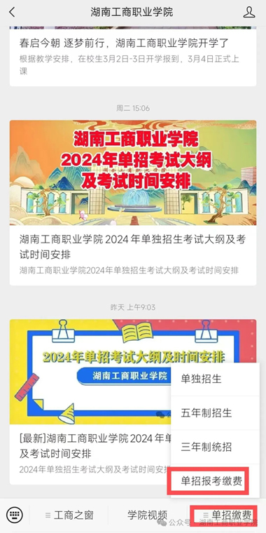 ②关注后进入以下页面,点击底部导航栏“单招缴费”“单招报考缴费”。