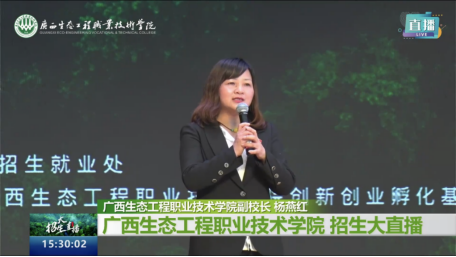 活动第一流程:杨燕红副校长致推荐词。杨副校长指出,广西生态工程职业技术学院作为全国第一所以“生态”命名的公办高职院校,具有65年的办学历史。学校是首批高技能人才培养示范基地,自治区示范性高等职业院校、特色高校、高水平专业群建设单位,中国(南方)现代林业职业教育集团理事长单位(国家职教示范集团)。学校开设有林业、经贸、园林、设计、旅游、汽信、建筑、环保等8大门类51个专业,在校生14620人。学校拥有广西第一批标准化大学生公寓及1万平米的现代化酒店式食堂、3A级景区、700多名专兼职教师、6亿多元的校内实训教学资源及185个实训基地。学校和300多家大型企事业建立了稳定的校企合作关系,这里是青年朋友们学习、生活、成长、成才的好地方!