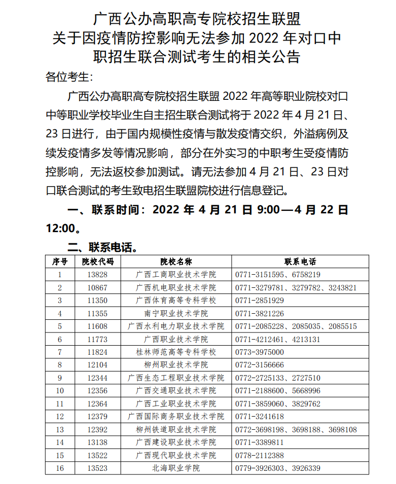 关于因疫情防控影响无法参加2022年对口中职招生联合测试考生的相关公告