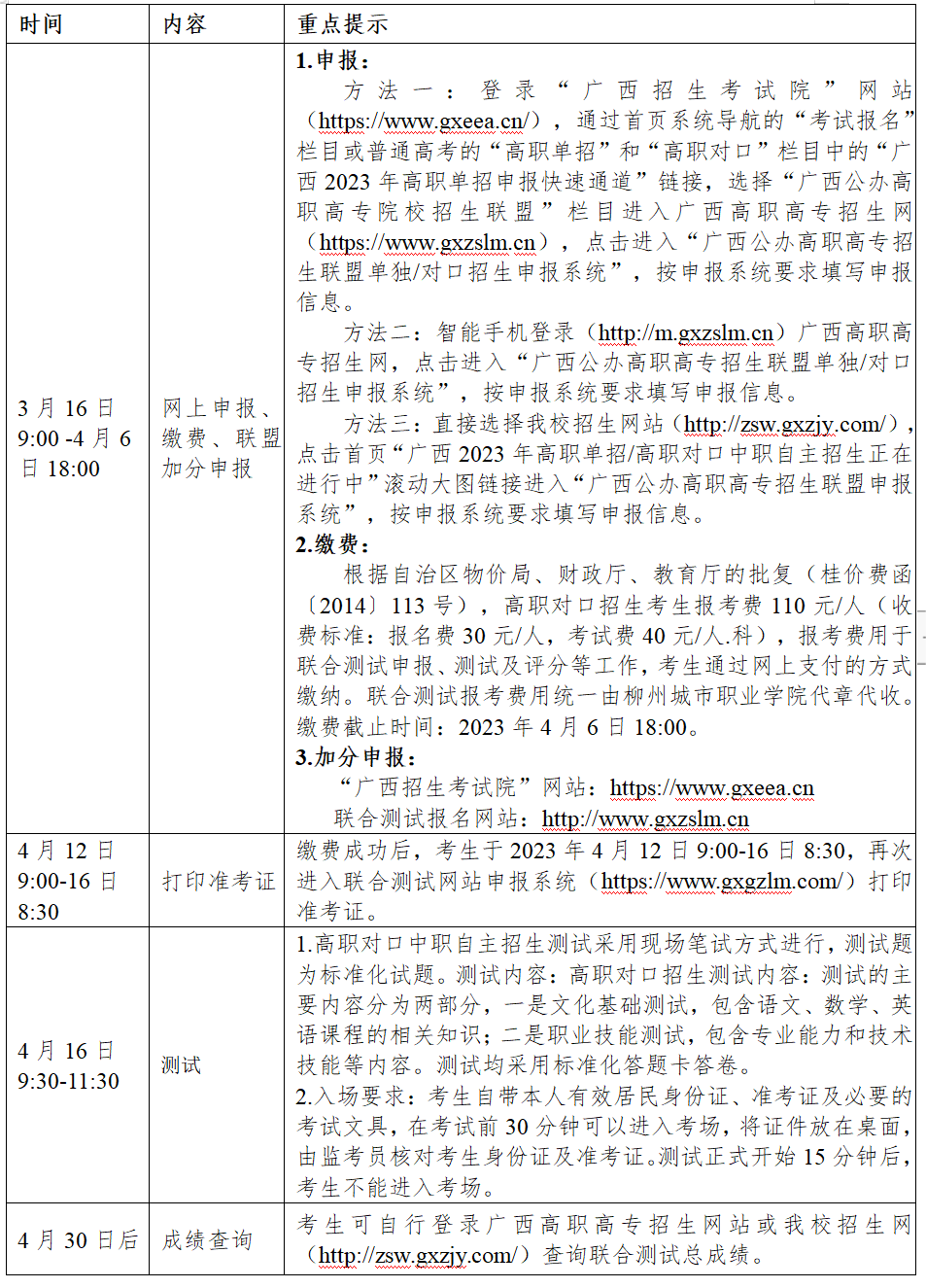 根据自治区物价局、财政厅、教育厅的批复(桂价费函〔2014〕113号),高职对口招生考生报考费110元/人(收费标准:报名费30元/人,考试费40元/人.科),报考费用于联合测试申报、测试及评分等工作,考生通过网上支付的方式缴纳。联合测试报考费用统一由柳州城市职业学院代章代收。缴费截止时间:2023年4月6日18:00。