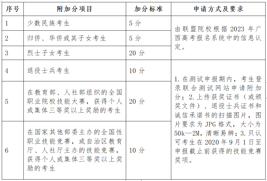 说明:①表中附加分项目及加分标准仅适用于本次联盟院校的高职对口中职自主招生联合测试;②同一考生符合多项加分条件的,只按其中最高一项加分分值计入总分。