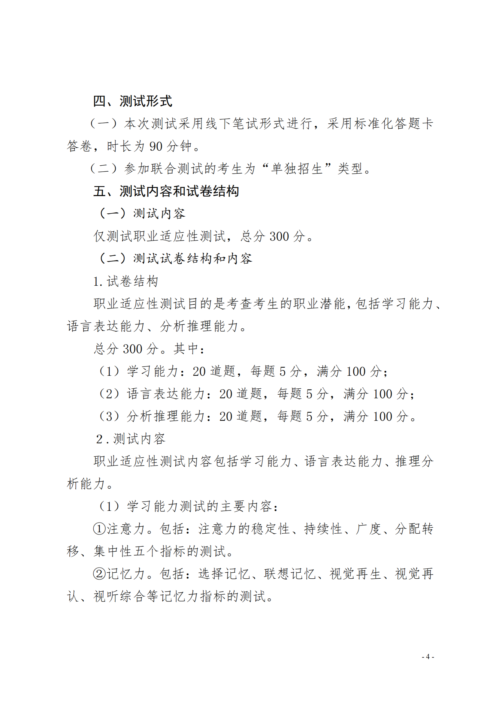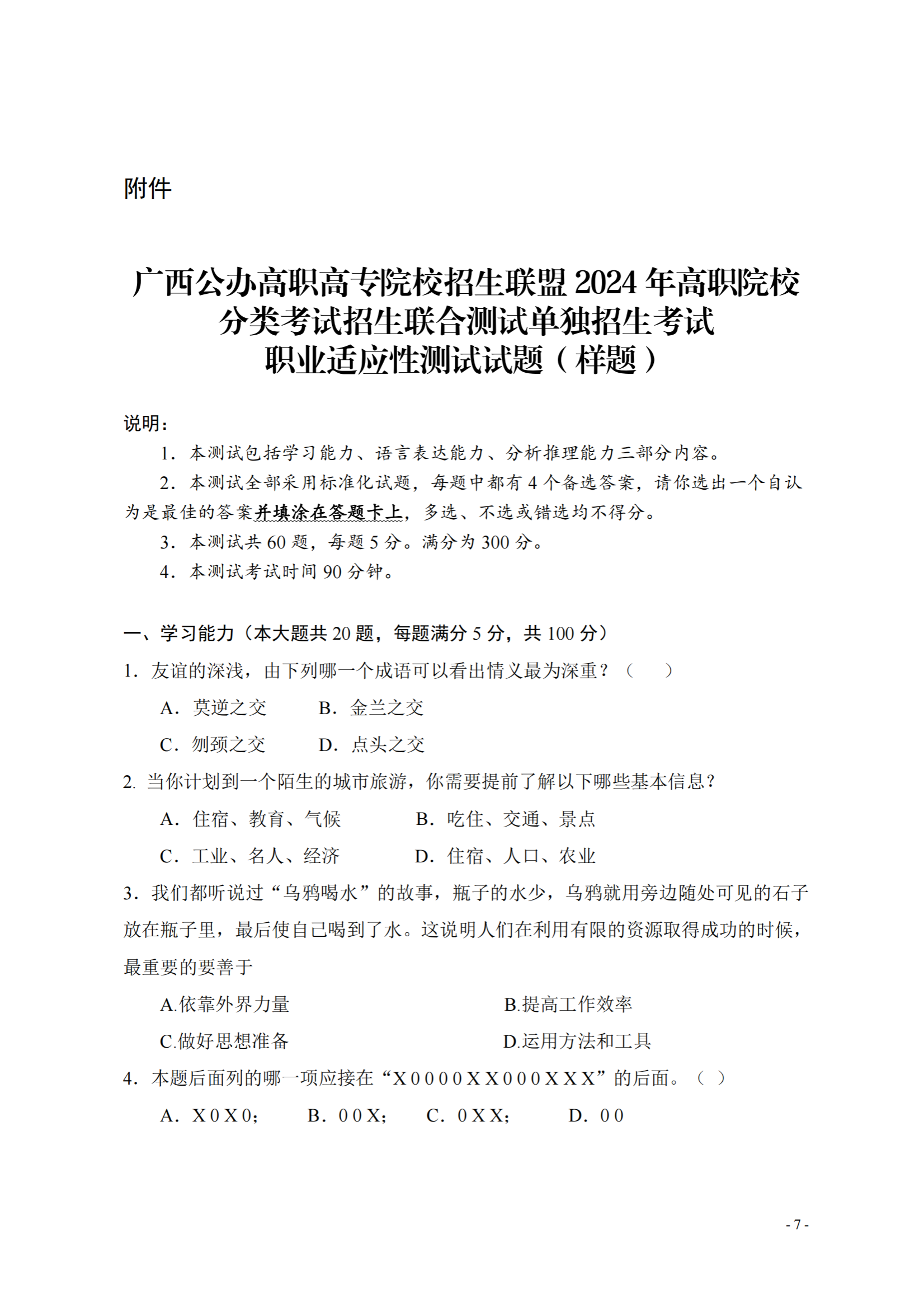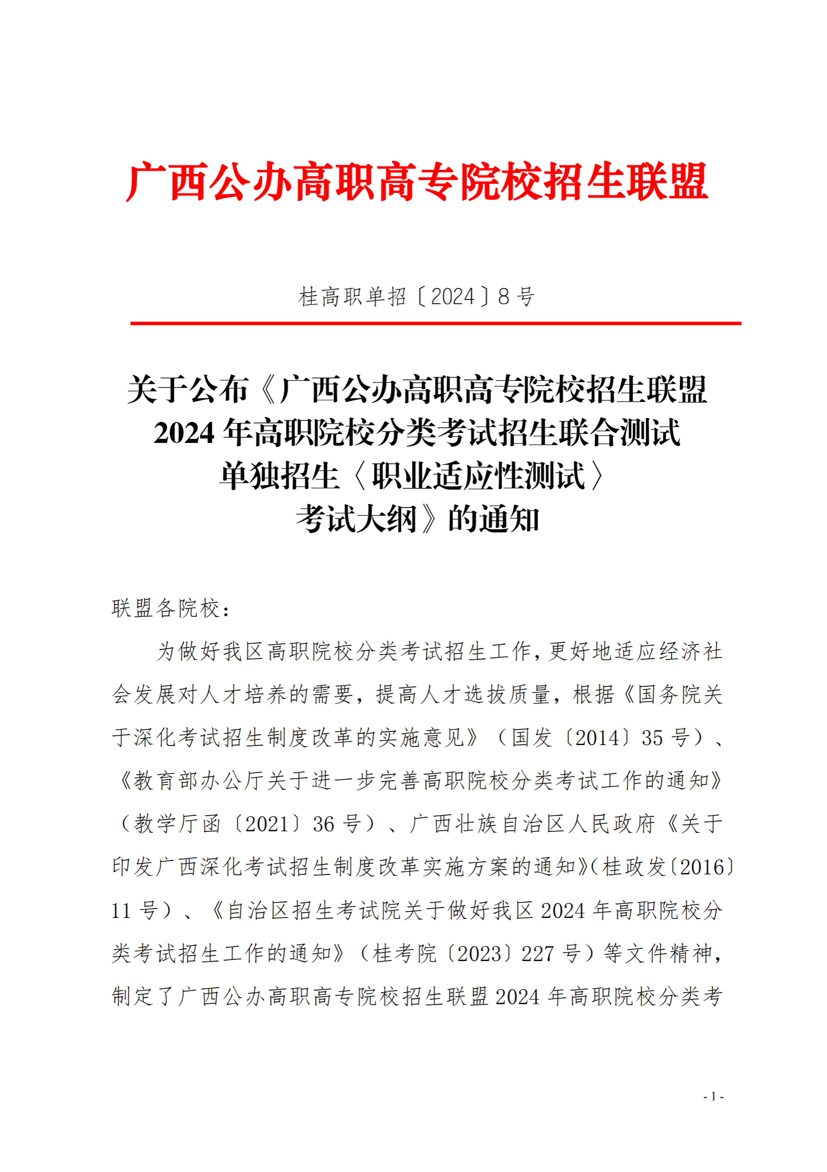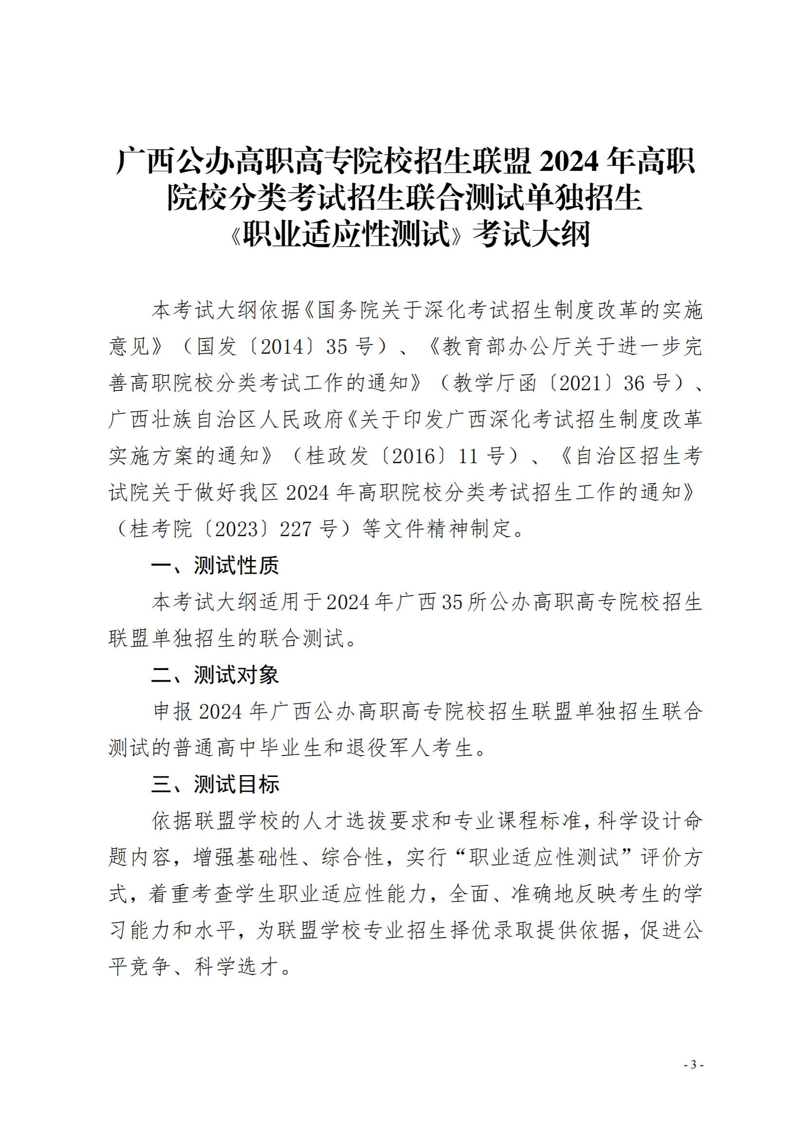 《广西公办高职高专院校招生联盟2024年高职院校分类考试招生联合测试单独招生〈职业适应性测试〉考试大纲》