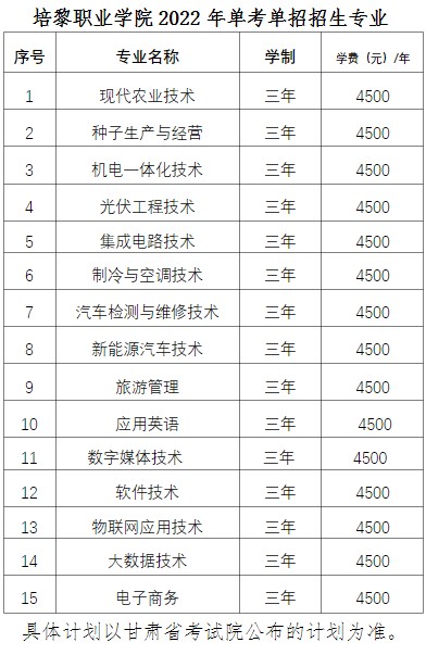 培黎职业学院2022年单考单招招生专业