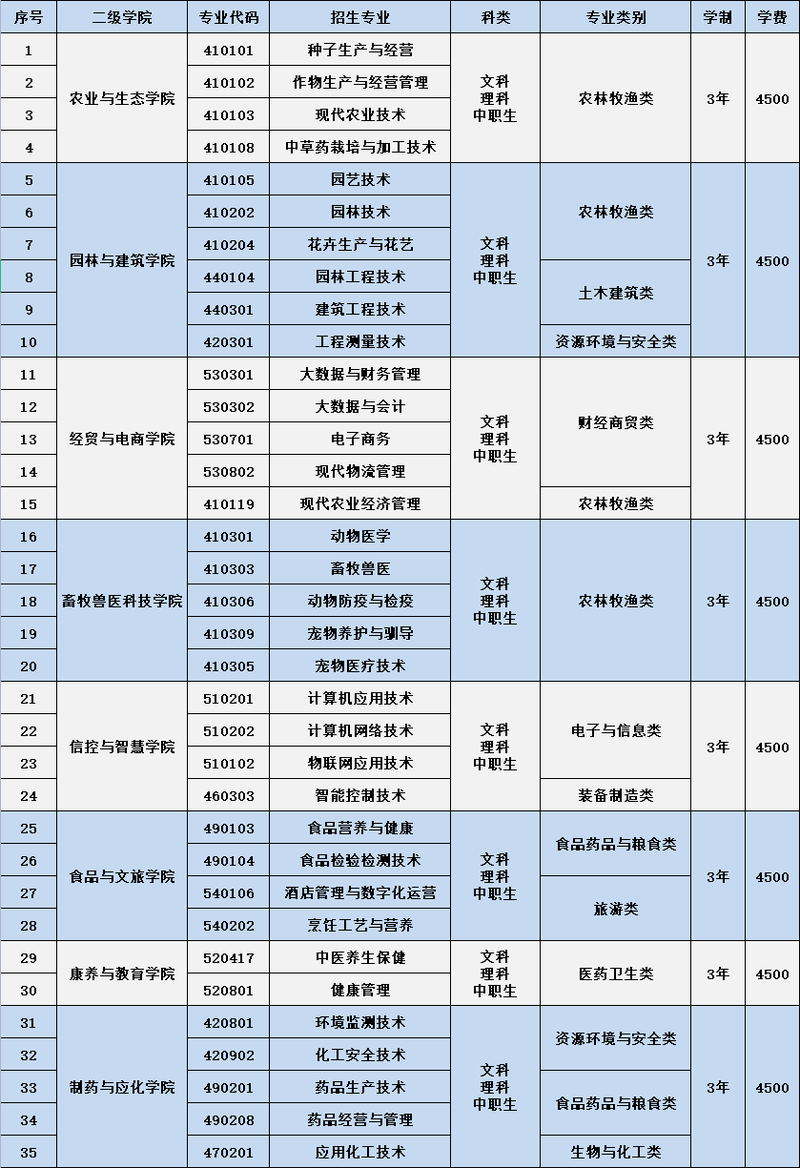 甘肃农业职业技术学院2023年招生专业