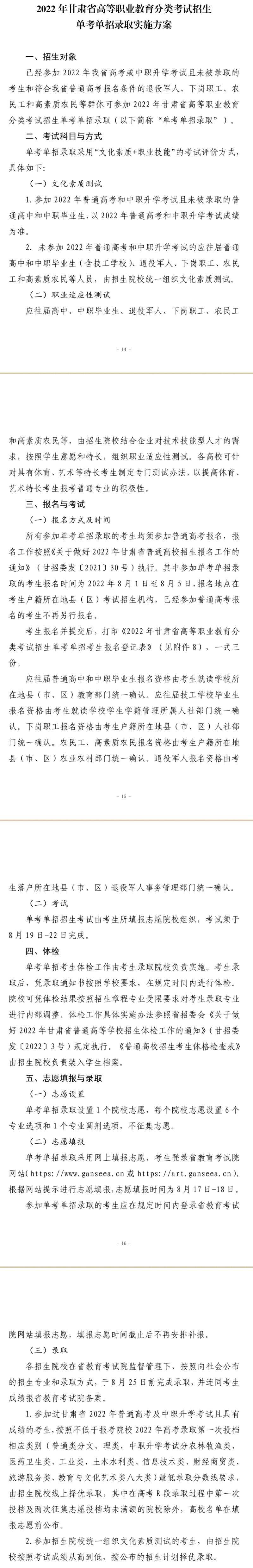 2022 年甘肃省高等职业教育分类考试招生单考单招录取实施方案