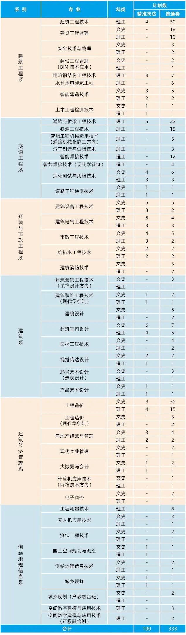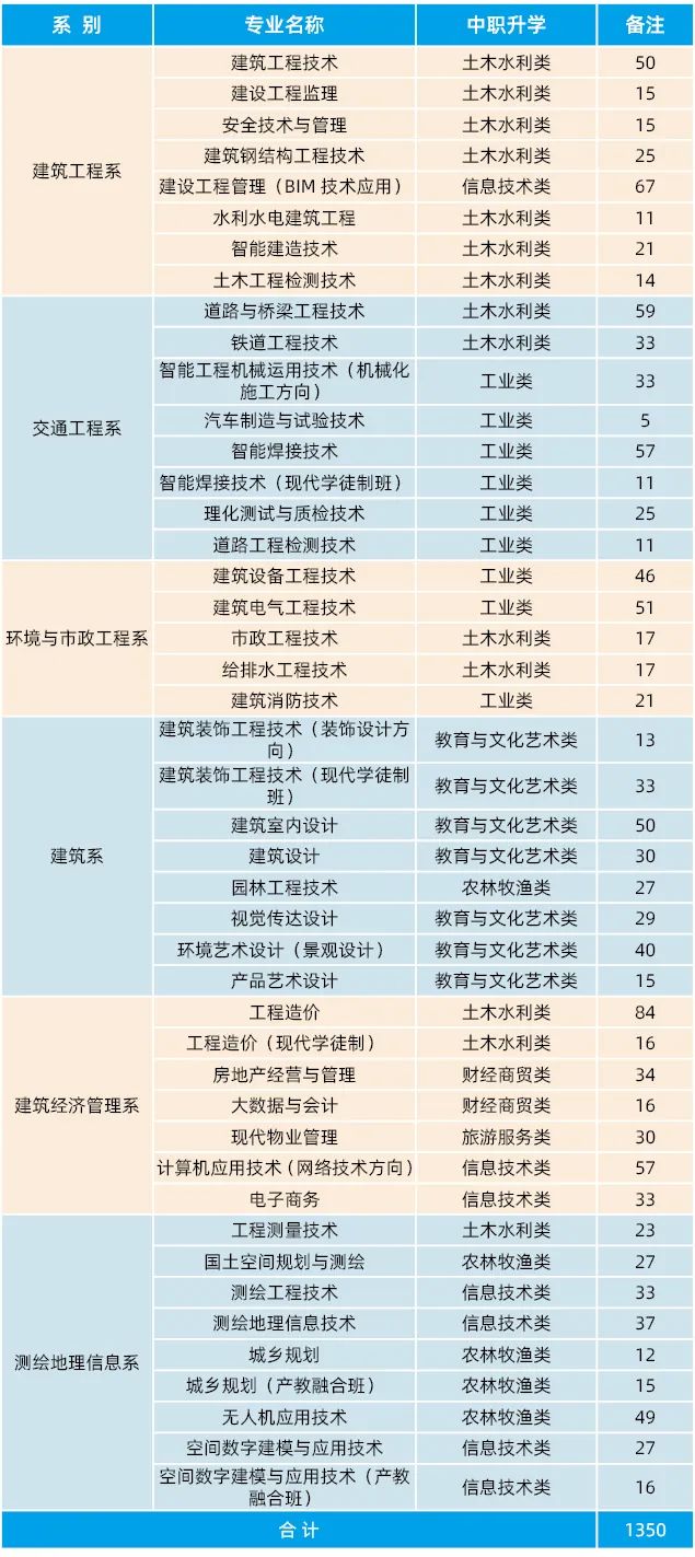 学院共有土木建筑、交通运输、资源环境与安全、水利、装备制造、电子与信息、财经商贸、轻工纺织、文化艺术9大类22个专业类41个专业,其中,国家级骨干专业5个,省级骨干专业6个,特色专业7个,省级示范院校重点专业5个,省优质校重点建设专业(群)8个,省级“双高”专业群1个。学院以产业聚焦、突出特色、错位发展、梯度建设为原则,构建了以建筑工程技术专业群、智能测绘与空间规划专业群为优势专业群,以安装工程技术专业群、环境艺术设计专业群为骨干专业群,以其他相关专业组群为培育专业群的“新型城镇空间”规划建设与服务一体两翼专业集群。