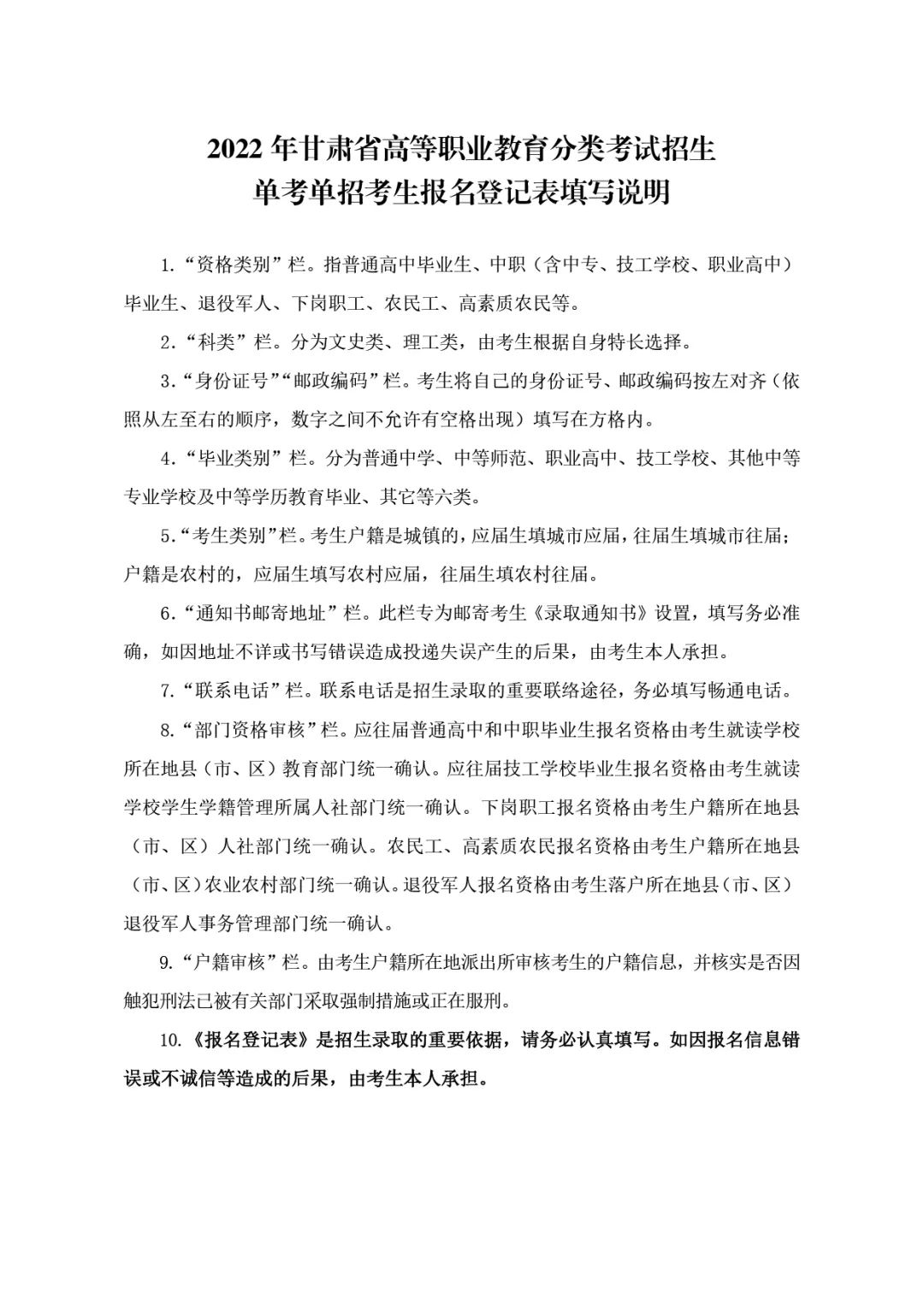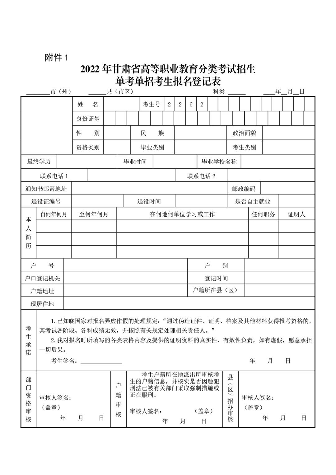 考生报名并提交后,打印《2022年甘肃省高等职业教育分类考试招生单考单招考生报名登记表》(见附件1),一式三份。报名表由考生在现场资格审核时交县(区)考试招生机构留存,最终作为考生档案寄送录取院校。