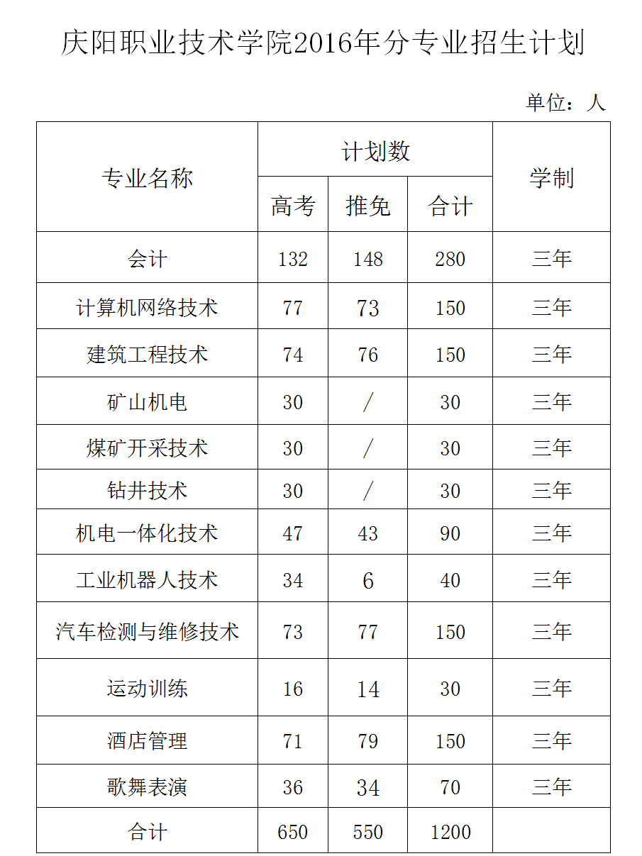 第二十六条 专业人数:2016年招生专业为:矿山机电、煤矿开采技术、钻井技术、建筑工程技术、会计、计算机网络技术、机电一体化技术、工业机器人技术、汽车检测与维修技术、运动训练、酒店管理、歌舞表演。分专业人数参见甘肃省普通高校招生办公室公布的招生计划。