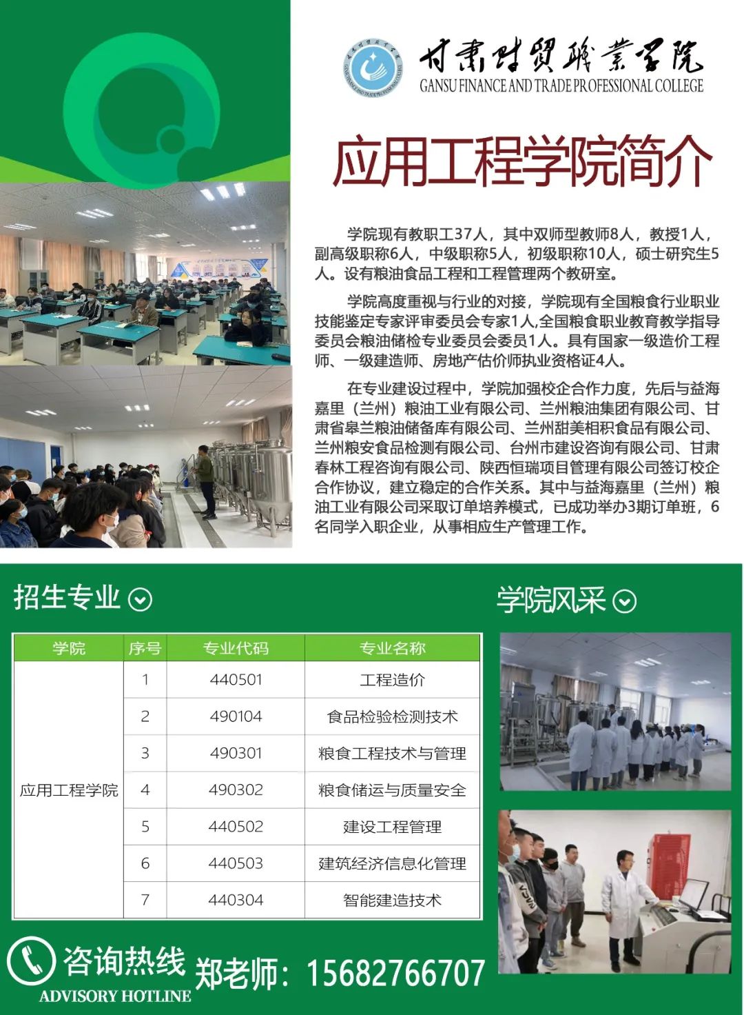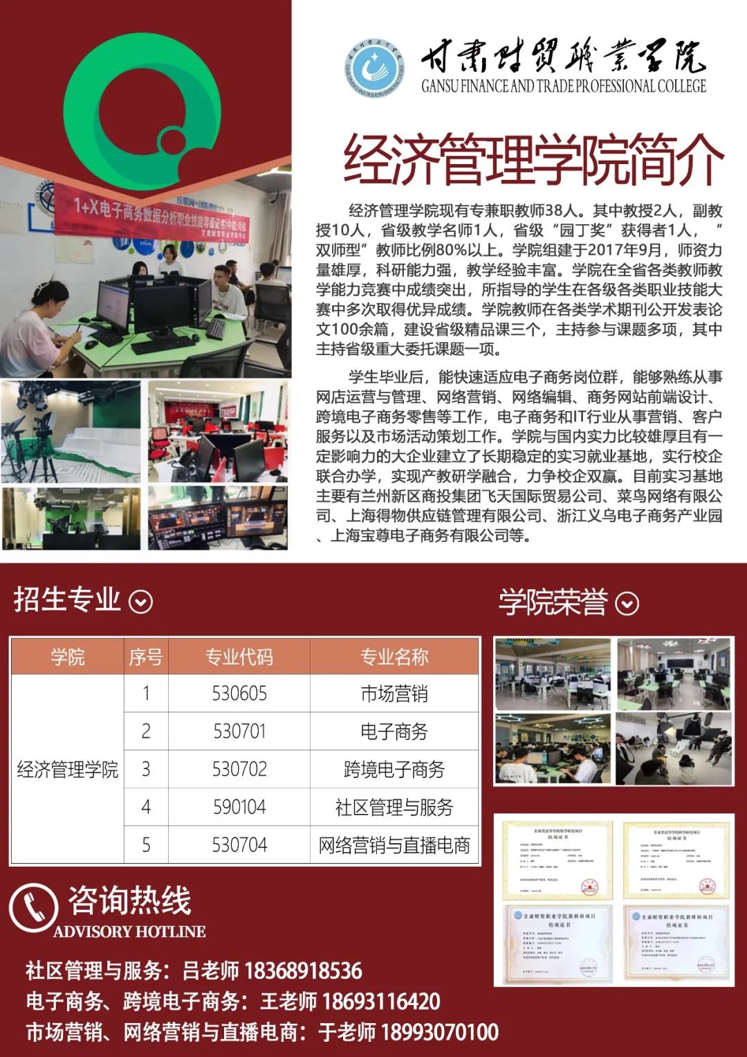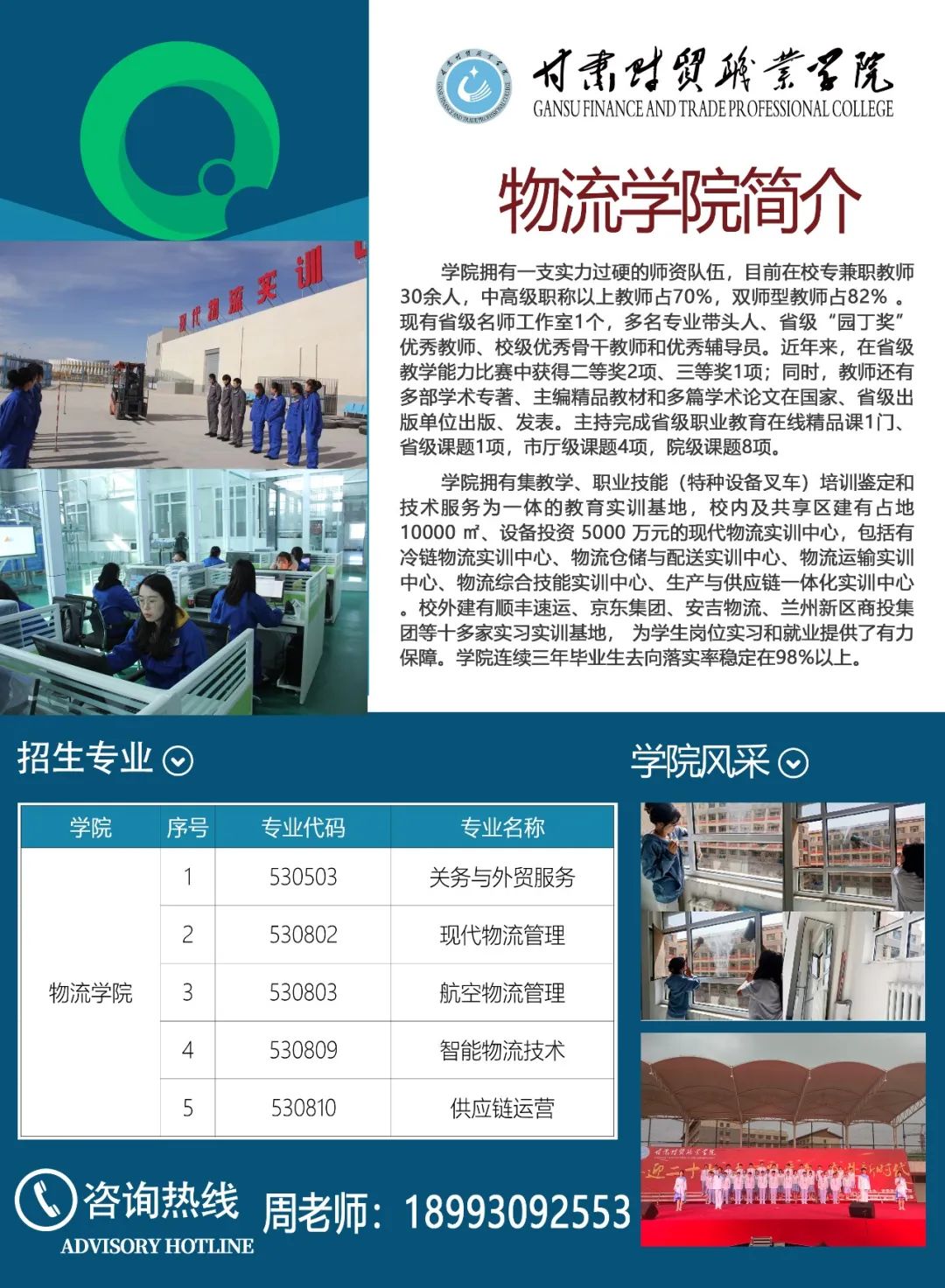 学院十分重视实践教学和校企合作,全院上下把就业工作作为核心工作:一方面加强创新创业培养,通过现代学徒制、订单培养等模式,努力提升就业质量,在省内外建有69个实训基地,与600余家大型企业建有良好的合作关系,为学生的高质量就业奠定基础。另一方面充分运用甘肃省商贸职业教育集团、甘肃省现代物流职业教育集团的影响和资源,为学生搭建就业平台,积极拓展就业渠道。每年为毕业生提供足够的优质企业岗位供学生选择。