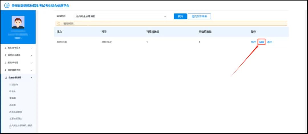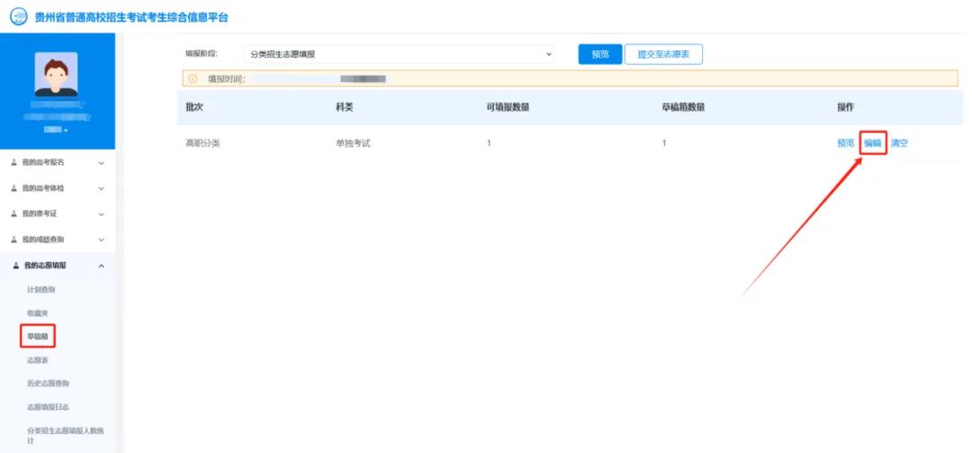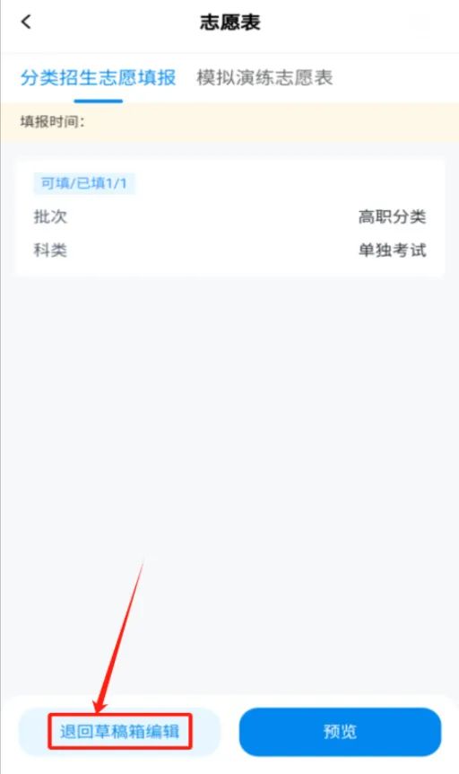 已提交志愿退回至草稿箱后,可在【草稿箱】中对志愿再次进行编辑,编辑结束后须再次进行提交。考生在志愿填报期间,最多可提交3次志愿,在填报时间截止后,所填报志愿不能进行任何修改。