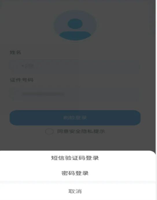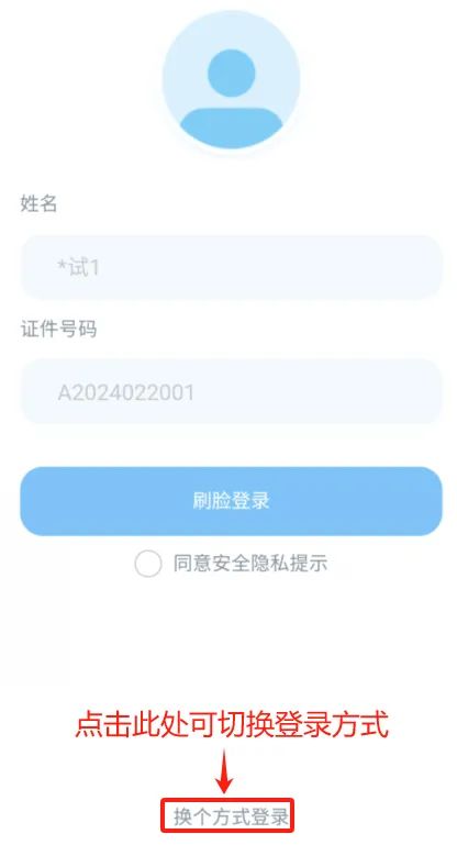 系统默认登录方式为【刷脸登录】,考生可点击下方【换个方式登录】,选择【短信验证码登录】或【密码登录】。