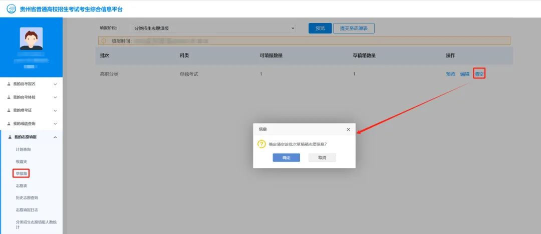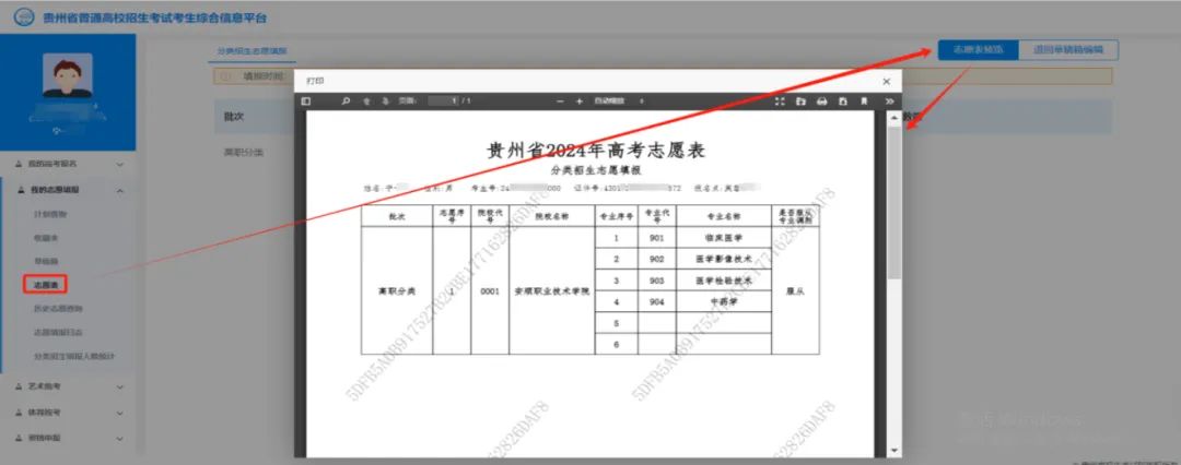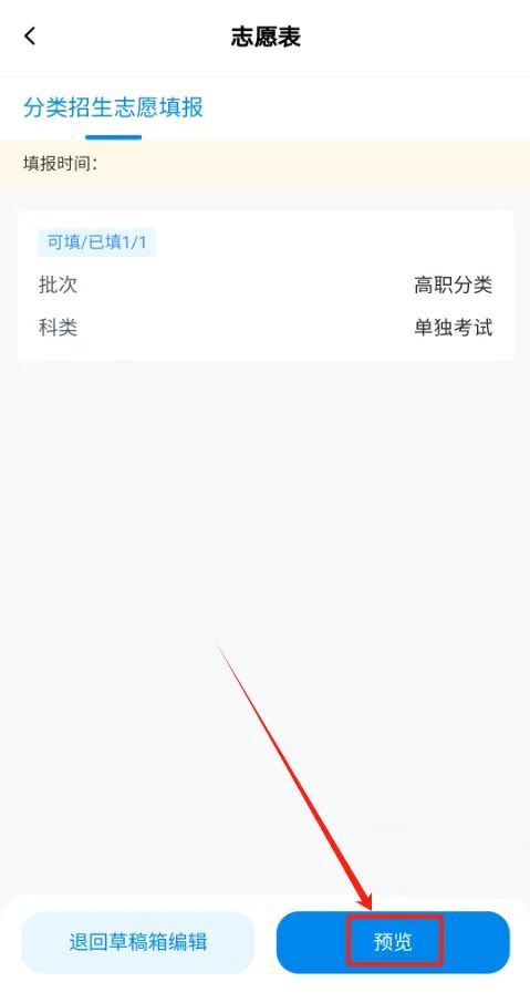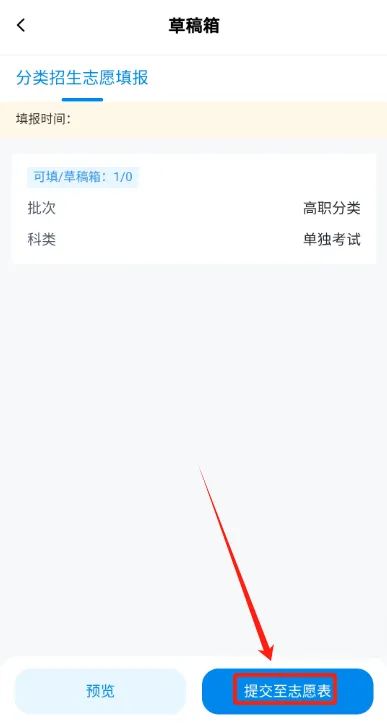 考生提交志愿草稿成功后,须点击【志愿表】→【志愿表预览】,查看和确认所填报的院校专业志愿是否提交成功。