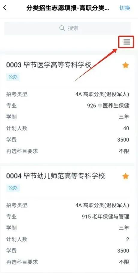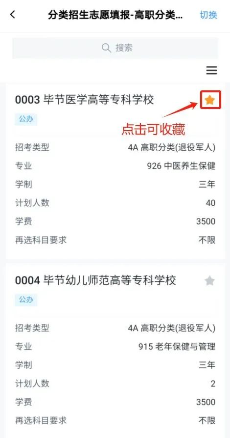 考生如想收藏某院校专业,可通过点击院校名称后★进行收藏。