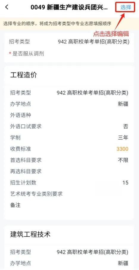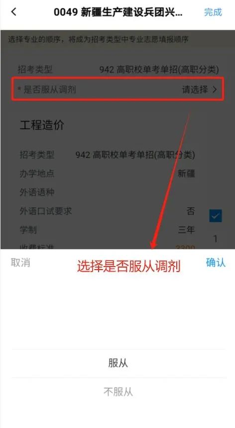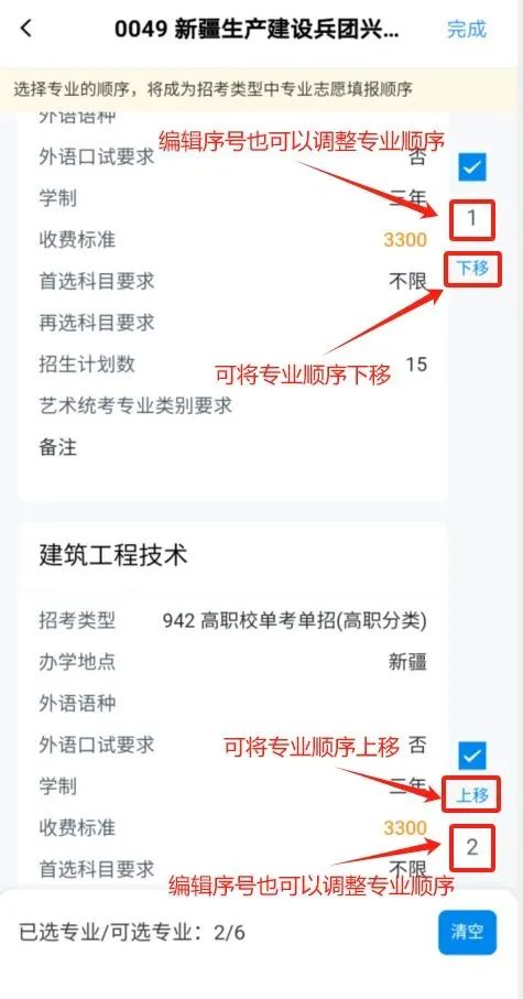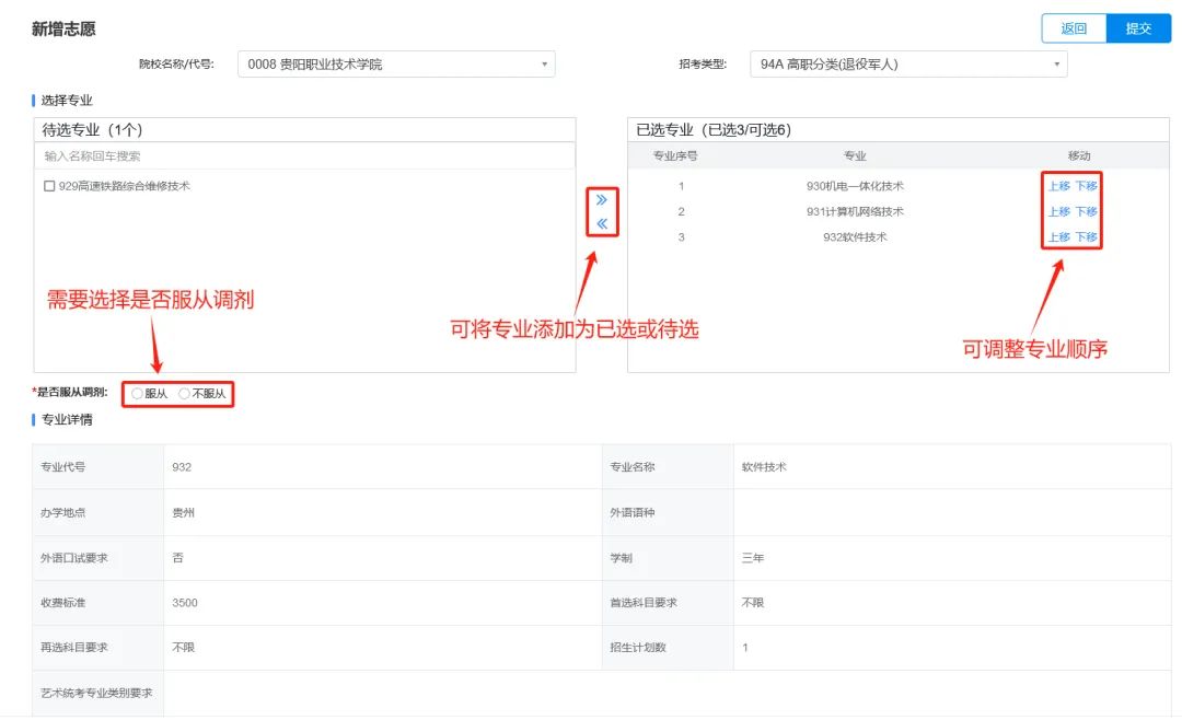 进入【草稿箱】,点击【已选/可选专业】可进入专业选择页面,点击右上角【选择】后,可在是否服从调剂栏选择【服从】或【不服从】,在专业栏点击【上移】【下移】或使用序号,可对专业进行排序。