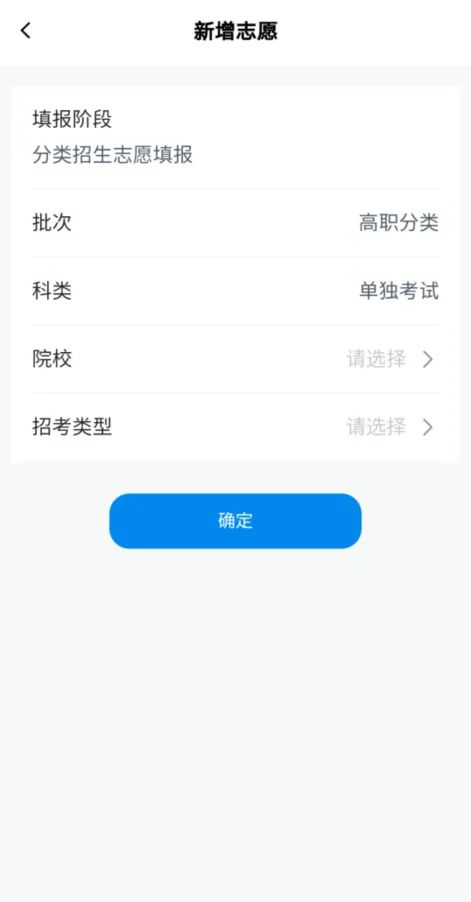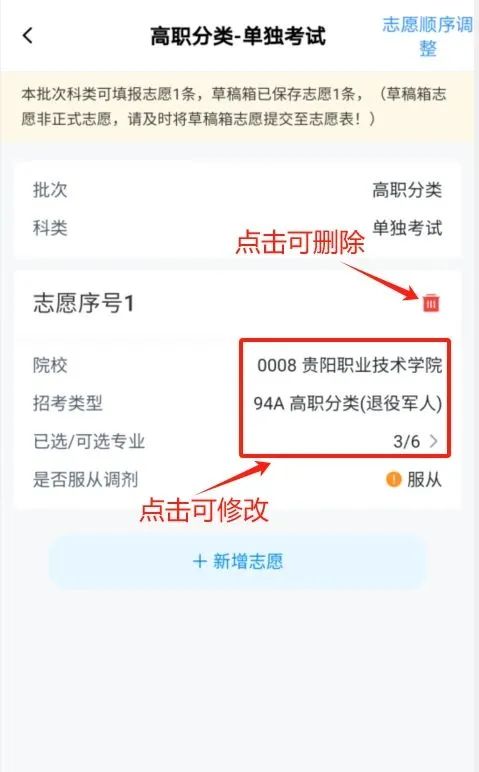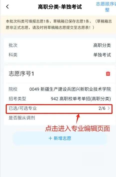 分类招生志愿填报只能填报1个院校志愿,该院校志愿下最多可选择6个专业。在填报时须先在草稿箱中填报志愿草稿,志愿草稿核对无误后,须提交至志愿表完成志愿填报。具体步骤如下: