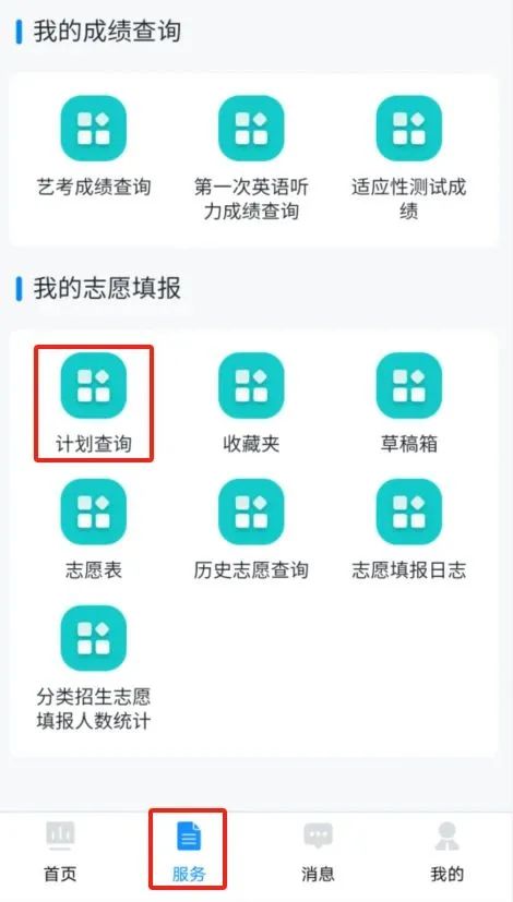 选择【服务】→【我的志愿填报】→【计划查询】,查询可填报的院校专业计划。