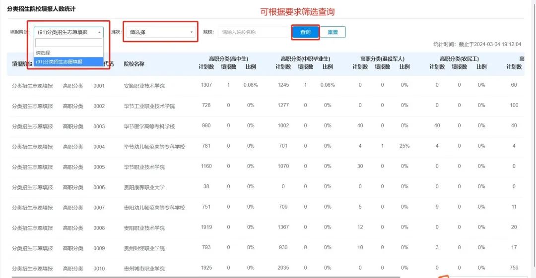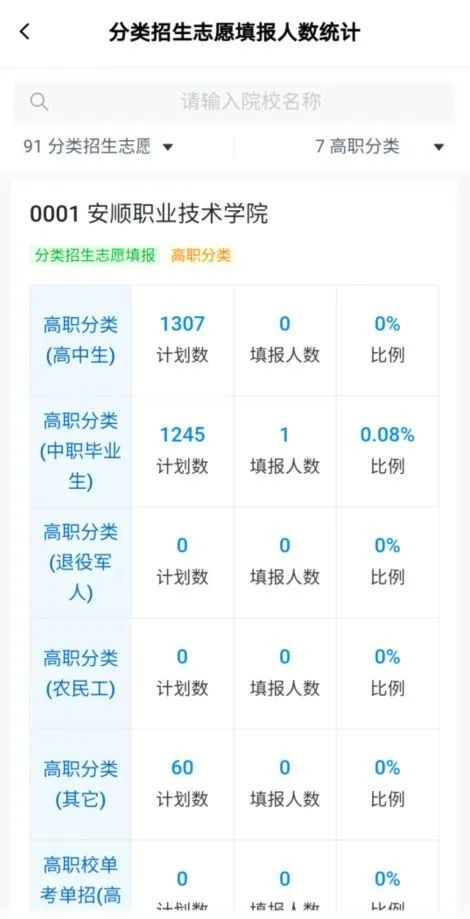 考生可点击【我的志愿填报】→【分类招生志愿填报人数统计】,查看各院校招生计划人数、填报人数及比例,可通过设置筛选条件查看某一院校的填报数据。