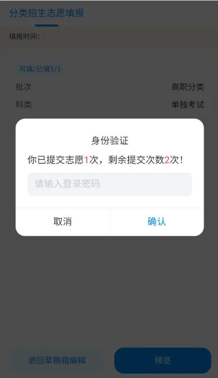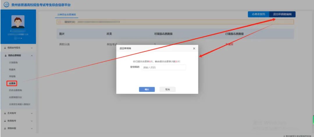 考生如需修改已提交志愿,可通过【志愿表】→【退回草稿编辑】,将已提交志愿退回至草稿箱,此时系统会提示已提交志愿表次数和剩余可提交次数。