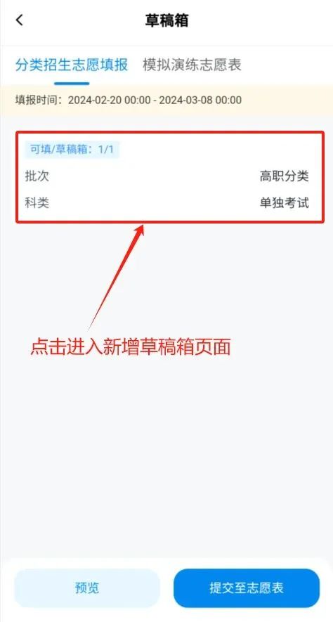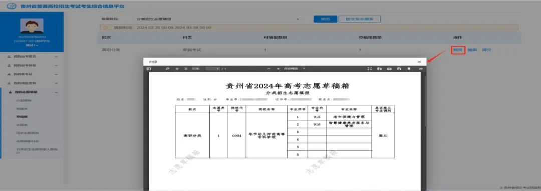 在草稿箱中添加志愿后,考生可通过【草稿箱】→【预览】功能,查看自己的“考生志愿草稿表”。