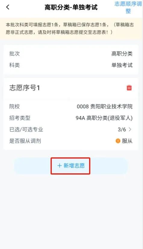 如草稿箱中已存在1个院校志愿,则不能添加其它院校志愿。如需添加其它院校志愿,可通过【服务】→【草稿箱】进入到志愿草稿页面,点击可删除草稿志愿。