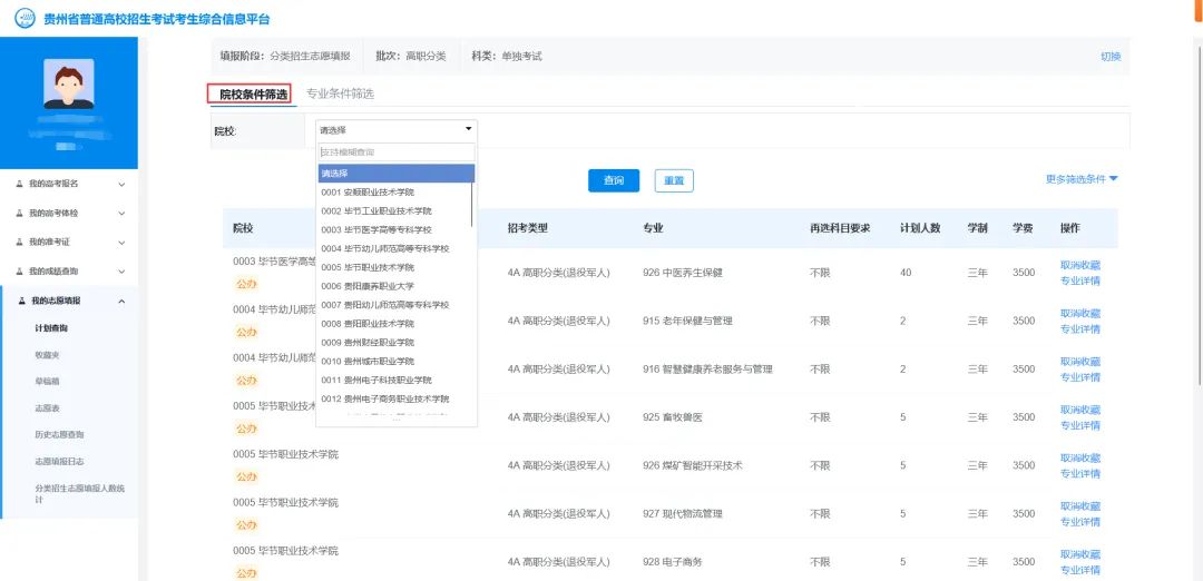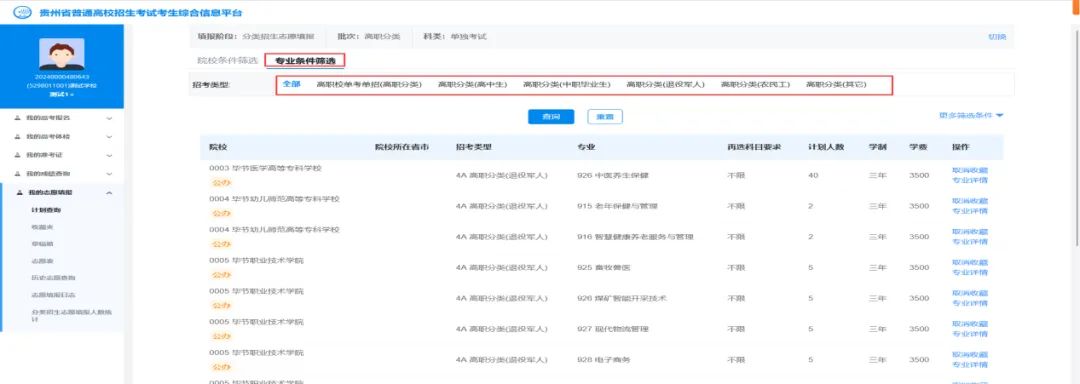 通过“院校条件筛选”和“专业条件筛选”筛选院校专业信息。不同考试类型的考生只能查询到对应招考类型下的招生计划。
