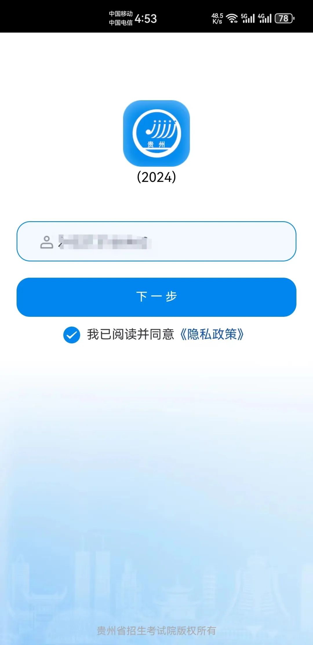 考生在手机上打开【贵州招考】APP,输入本人考生号或证件号或手机号,选择【我已阅读并同意《隐私政策》】,点击下一步。