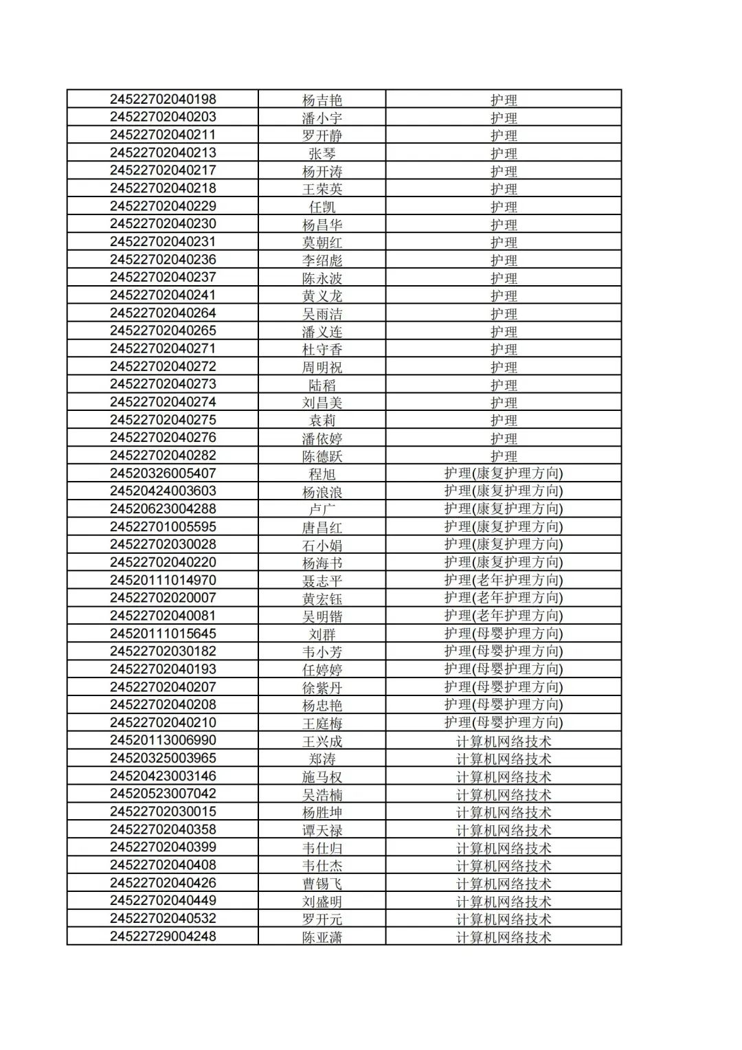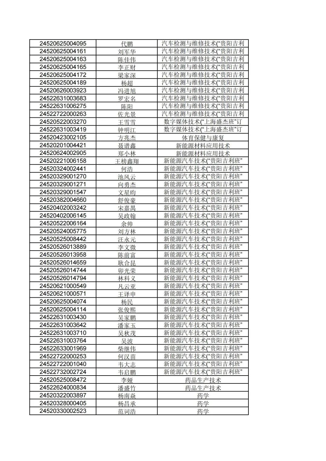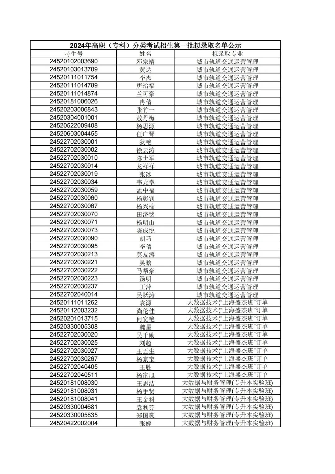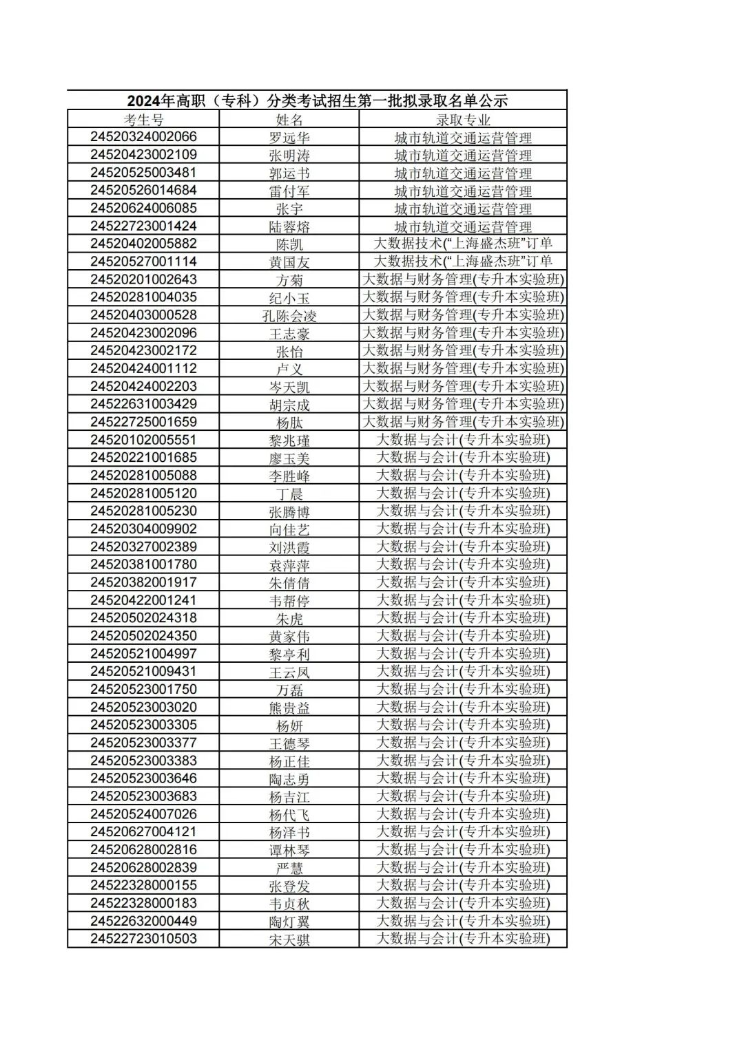 根据贵州省2024年高职(专科)分类考试招生第一批拟录取名单公示,现将填报我院志愿经过报考资格审核合格,同时参加职业技能(适应性)测试合格的考生,按照"文化素质+职业技能"综合评价录取原则择优录取,名单公示如下: