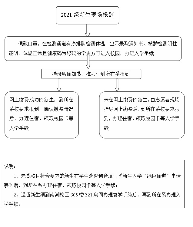 说明: 1、未贷款且符合要求的新生在学生处咨询台填写《新生入学“绿色通道”申请表》后,到所在系办理住宿、领取校园卡等入学手续; 2、退伍新生须到南湖校区306楼321房间办理复学手续后,再到所在系办理入学手续。 |