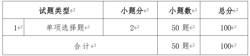 均为单项选择题,满分100分(共50题,每题2分)。分值如下表:
