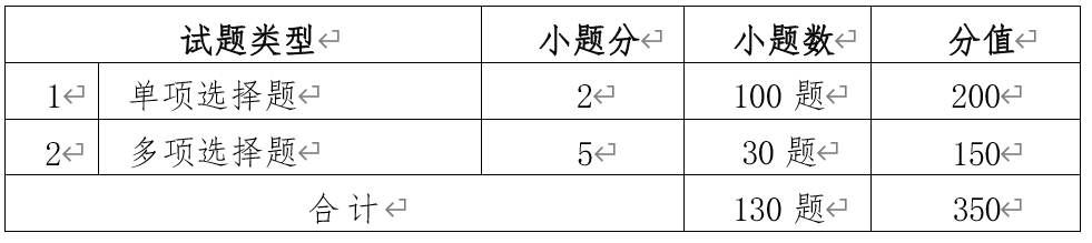 (三)试卷结构由单项选择题、多项选择题构成,满分350分(其中单项选择题100题,每题2分;多项选择题30题,每题5分)。分值比例如下表: