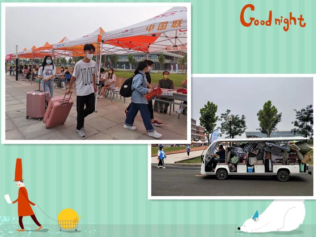 旅游车和志愿者们安排井然有序,分工明确,全程“一站式”式服务。搬行李的,解答问题的,维持秩序的,指路的,接待的,全程无缝衔接。年轻的面孔,温馨的问候,甜美的笑容,周到的接待,细致的讲解,让因为疫情不能进校的家长放下了担忧,让学子们卸下了心防,驱除了陌生,对新的校园生活充满希望和憧憬。