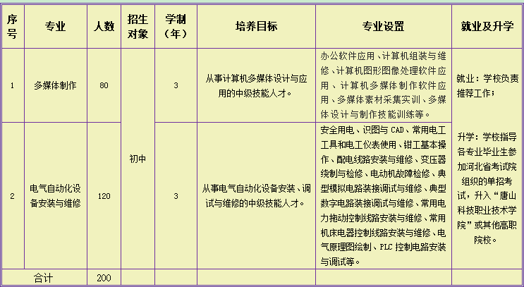报名安排: 1. 报名方式:只招收应届初中毕业生,即2024年初中毕业生; 2. 报名时间:2024年7月1日起扫描我院发布的报名二维码(附后)填报信息完成报名; 3. 资格审查:要求考生五官端正、身体健康、无纹身。报名我校的考生请于7月13日上午8点-11点到校进行面试,面试合格方可入学,面试时请携带填写完整的新生报名表(报名表可从报名小程序或学校官网下载)。 4. 收费标准: (1)学费: 2300元/年【农村户口、县镇非农户口、城市户口(有低保证的)免交学费,报到时请出示相关证明材料,证明材料包括户口本(低保证)原件及复印件(户口本上须有农业户口字样,如果没有,请到村大队开具证明)】。建档立卡家庭户报到时需提供相关证明材料,可享受国家优惠政策; (2)住宿费:500元/年; 5. 学校地址及联系电话:河北省唐山市路南区警钢路68号 0315-2962669
