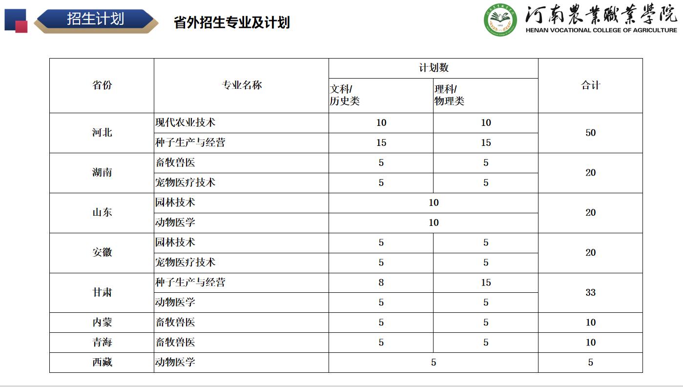 河南农业职业学院2024年全日制普通专科省外招生专业及计划
