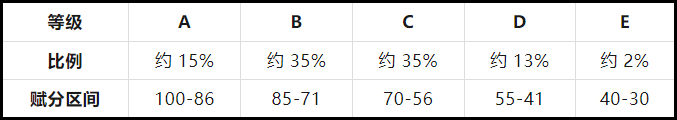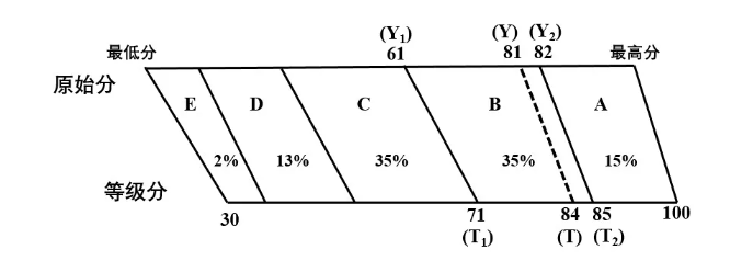(1)等级换算对应关系。各等级及其所占人数比例、等级分赋分区间对应关系如下表所示。