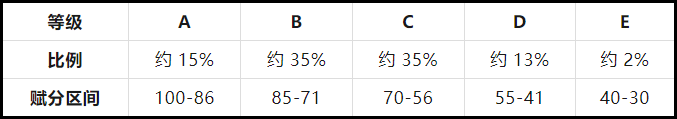 (二)将等级转换为等级分数。等级分数的满分值为100分、起点分值为30分,从A至E每个等级按照1分1档的分数间隔对各个等级进行连续赋分,各个等级的等级赋分区间从15到11分不等(见表1)。根据每个考生的原始分数及其所在等级的等级赋分区间,运用等比例转换法则将其原始分换算成等级分数。