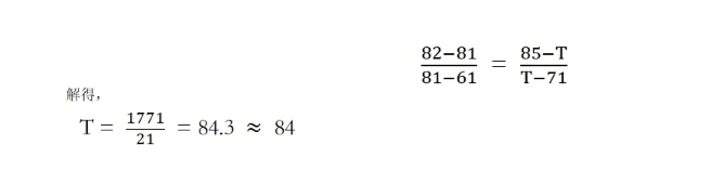 假设某同学思想政治学科原始分为81分,而该学科B等级的原始分分布区间为82~61,则该同学思想政治学科的原始分属B等级,B等级的等级分分布区间为85~71,按照转换公式该同学思想政治学科的等级分为: