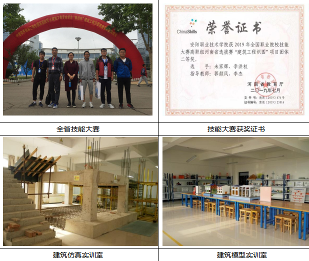 建筑设计与工程学院校内实训基地有14个,主要有:钢筋实训室、测量实训室、仿真实训室、建筑模型实训室、建筑智能化实训室、造价实训室等,实训基地面积为2560平方米,设备总值800多万,是河南省高等职业教育省级示范性实训基地。在全国职业院校技能大赛高职组河南选拔赛建筑工程识图大赛中屡获佳绩,2021年全国数字建筑创新应用大赛获特等奖。