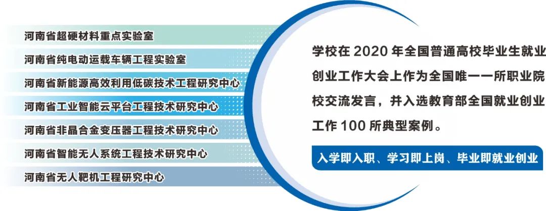 学校毕业生就业率稳保97%以上,毕业生平均工资8500元/月以上,企业满意度96.68%。与9个产业园区、130个单位深度合作,共建产业学院或现场工程师学院25个;为397家企业提供技术、培训服务,攻克技术难题508项,获省科技进步奖5项、发明专利315项;实现技术转化61项,累计产生经济效益达11.4亿元。学校先后被评为:全国就业创业工作典型案例学校;全国高职院校资源建设优势学校;全国优秀产教融合校企合作案例;河南省“双高工程”建设学校;河南省职业教育品牌示范校;河南省优质高等职业院校;河南省示范性职业教育集团等50多项荣誉。