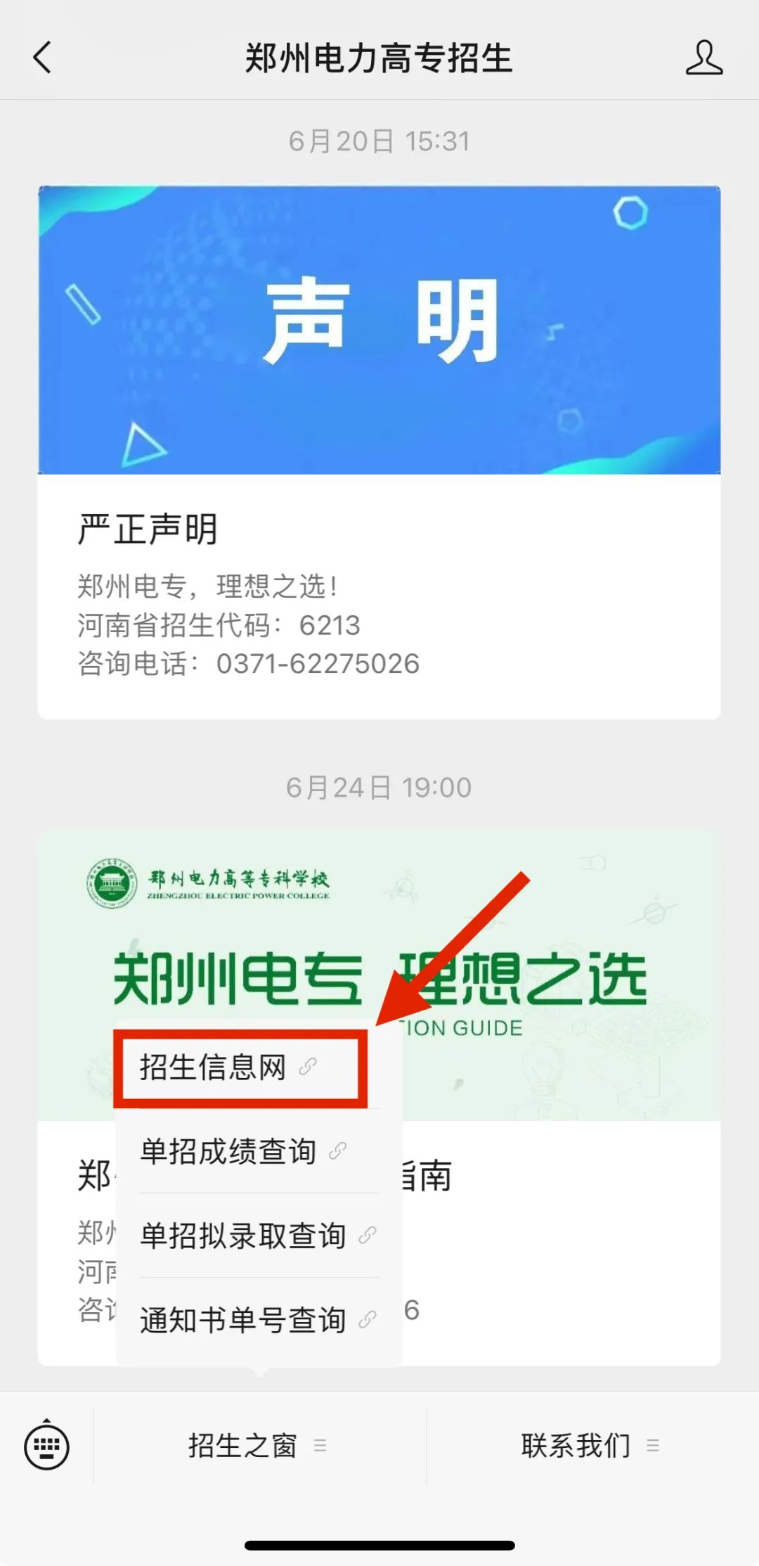 进入公众号,点击屏幕下方菜单左侧的“招生之窗”菜单,进入“招生信息网”。