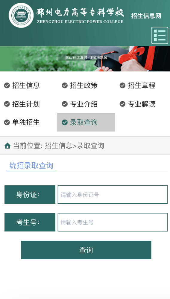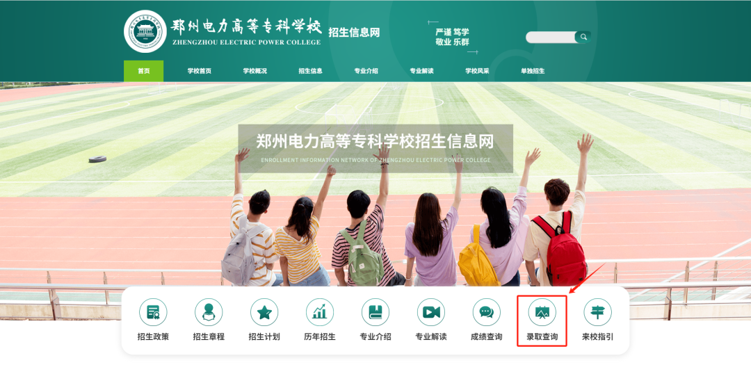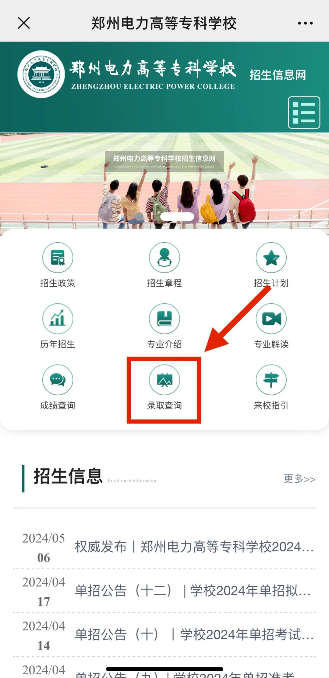 进入“郑州电力高等专科学校招生信息网” ,在首页点击“录取查询”按钮。