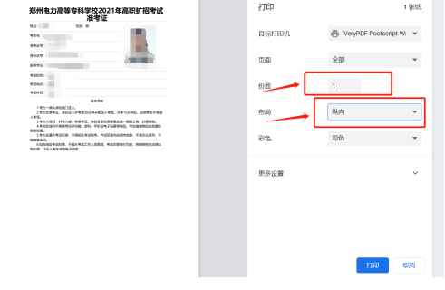 按系统提示路径打印准考证。请选择“纵向打印”。考生可多打印几张准考证做备用。