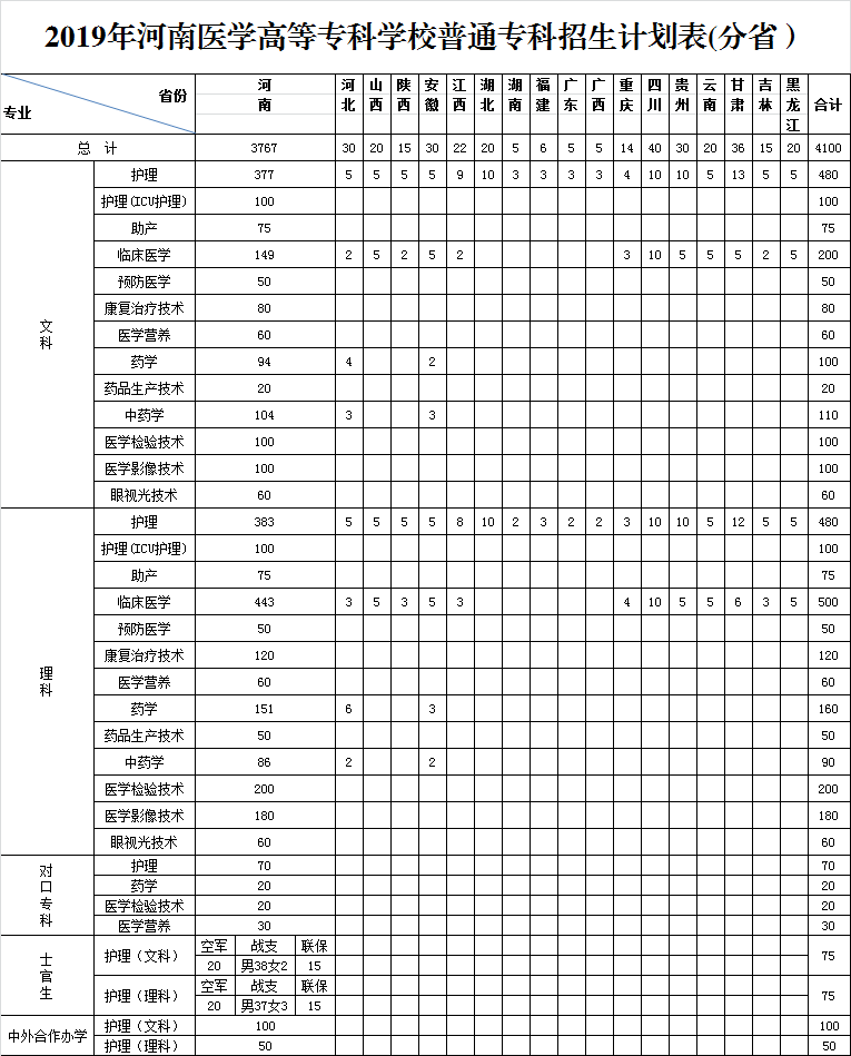 2019年河南医学高等专科学校普通专科招生计划
