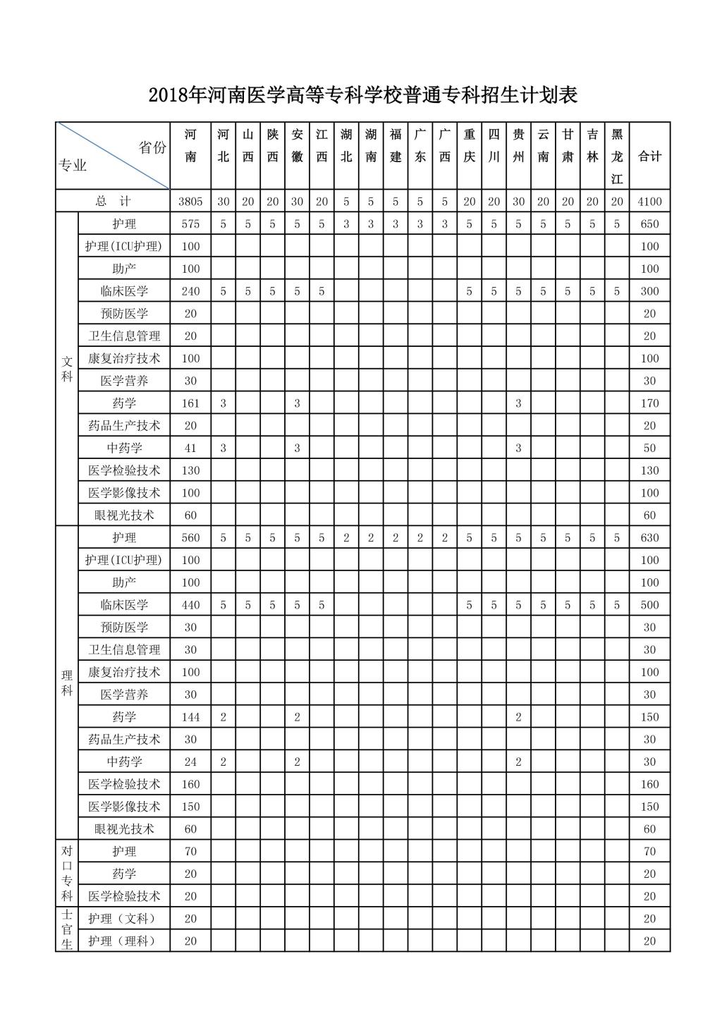 2018年河南医学高等专科学校普通专科招生计划