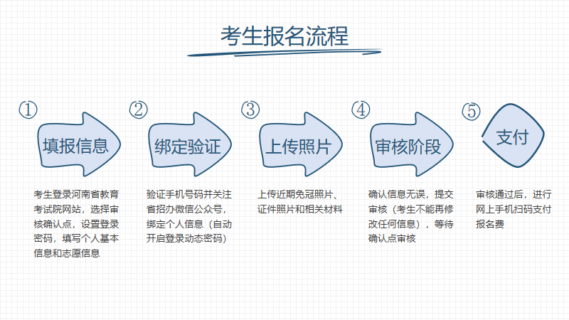 2.报名流程:登录河南省教育考试院网站(http://www.haeea.cn/),按提示填写个人信息和志愿信息(我校代码为441),完成报考后,请考生妥善保管网上报名考生号和密码。报名流程如下。