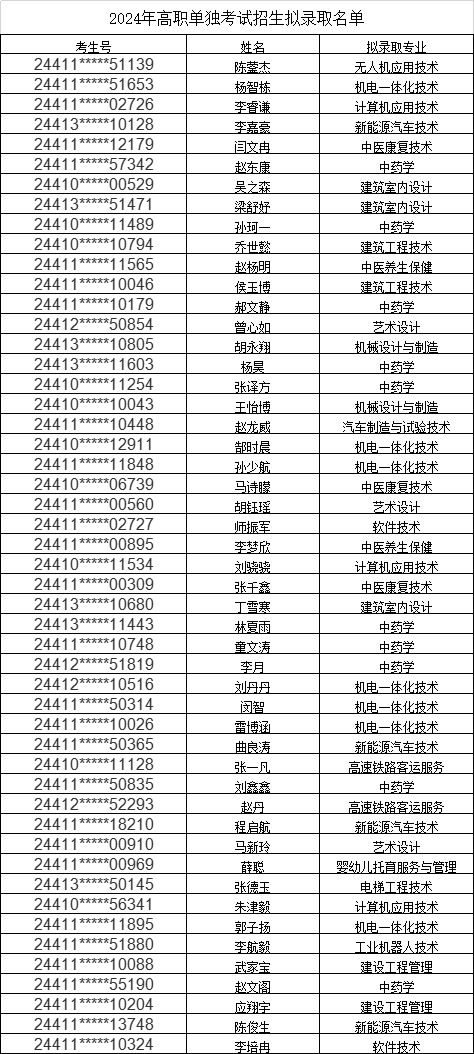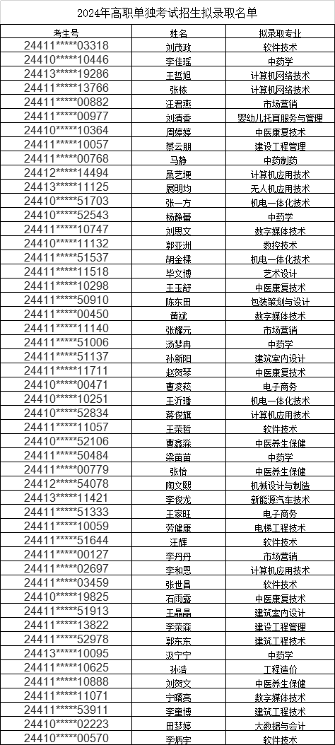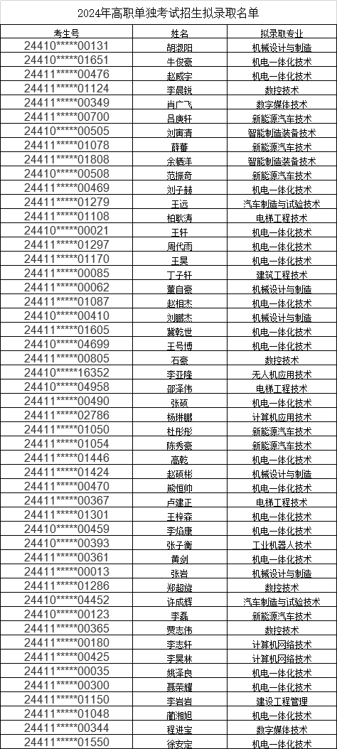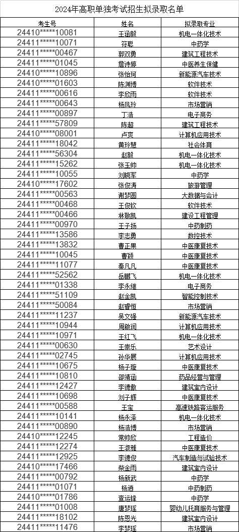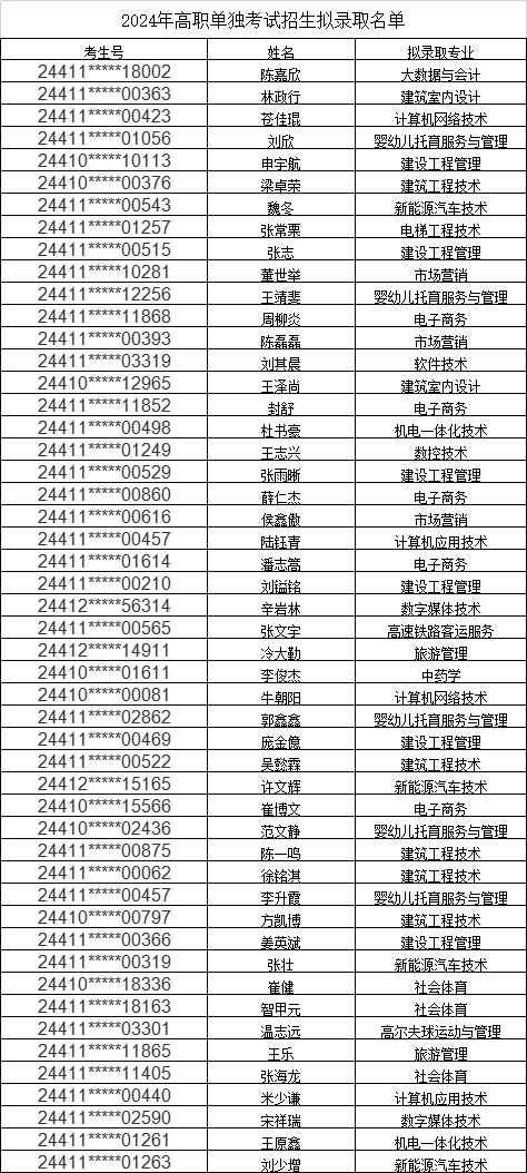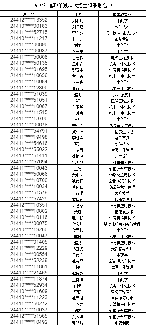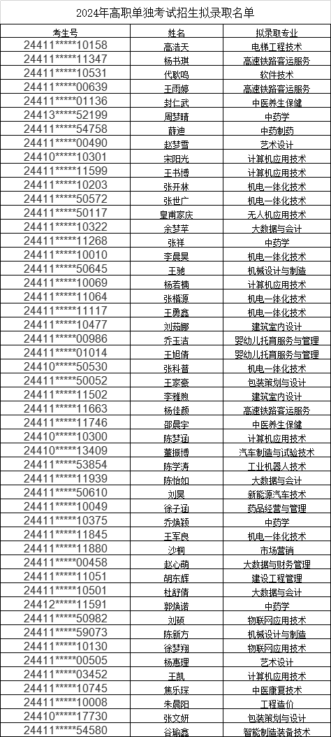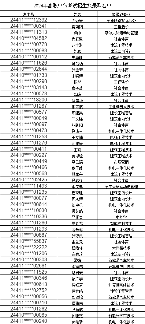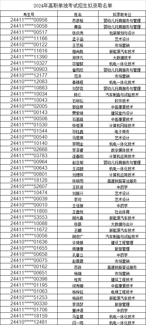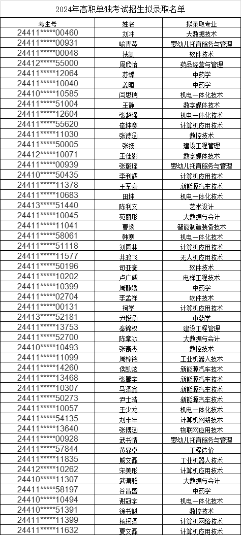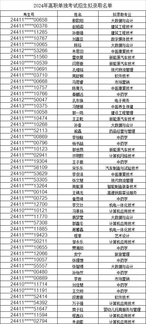 根据《河南省教育厅关于做好2024年高等职业教育单独考试招生和技能拔尖人才免试入学工作的通知》(教学〔2024〕58 号)文件精神,按照我校2024年高职单独考试招生章程有关规定,经学校高职单招工作领导小组审核批准。现将拟录取结果公示如下:
