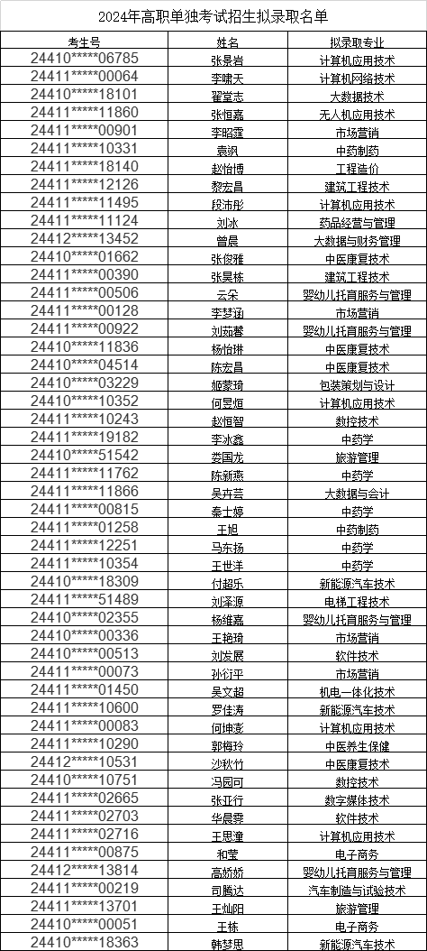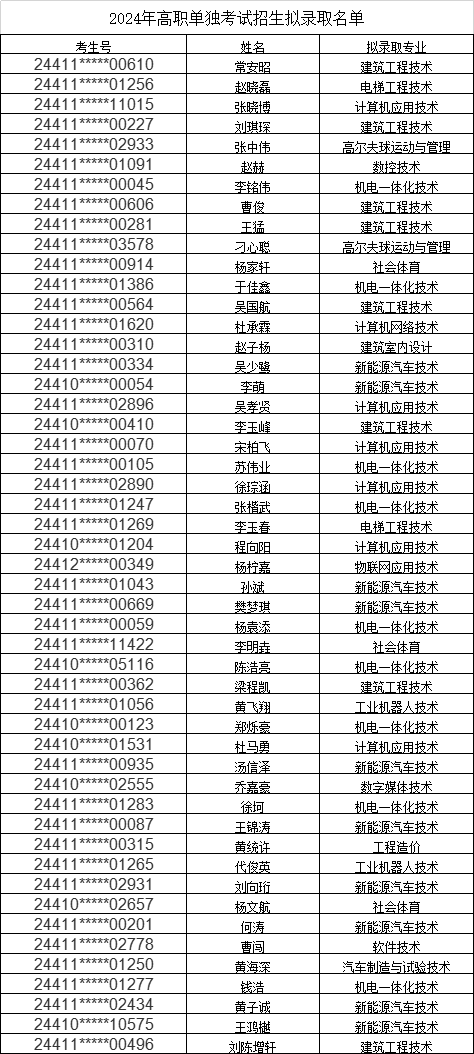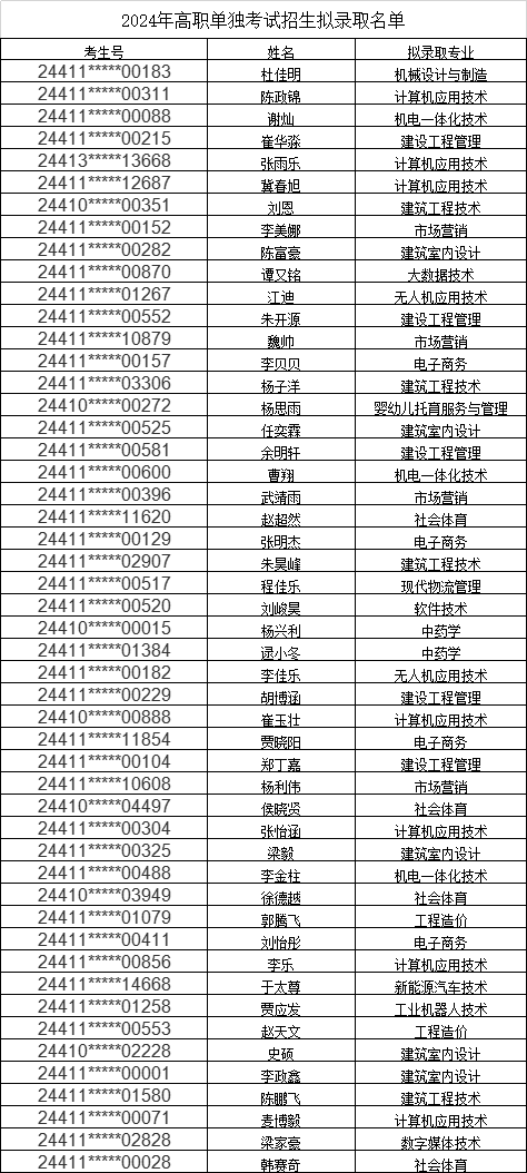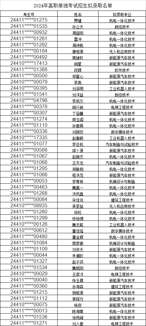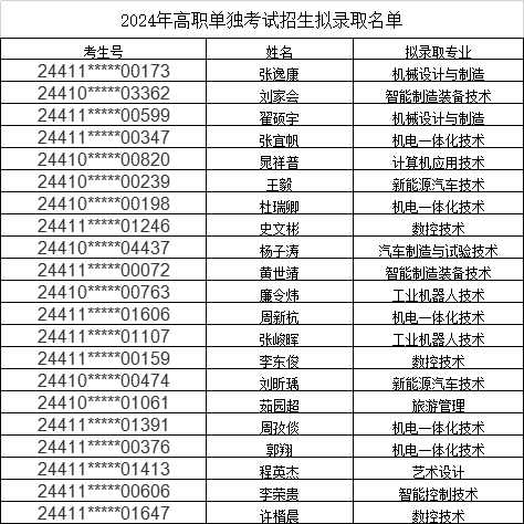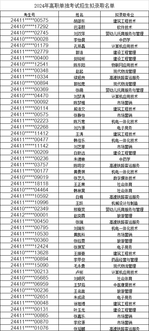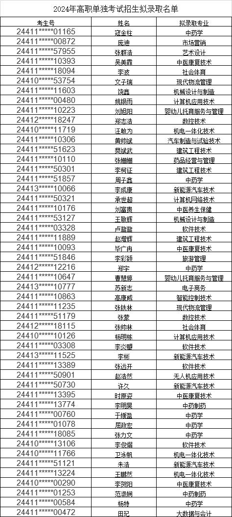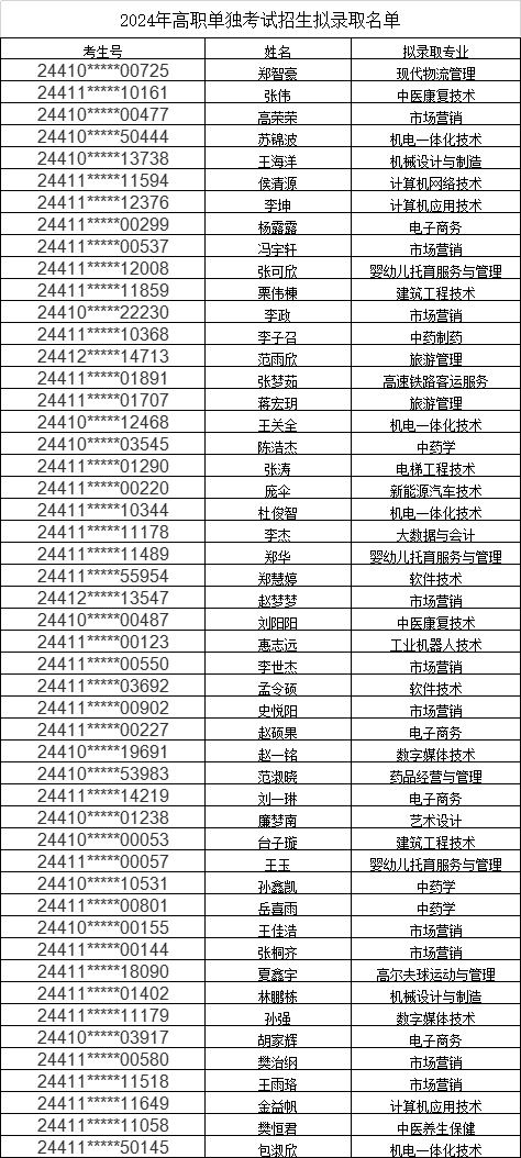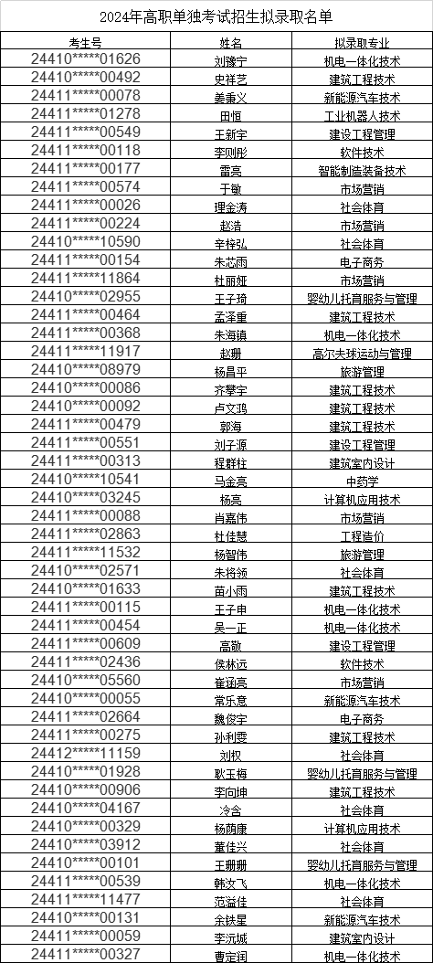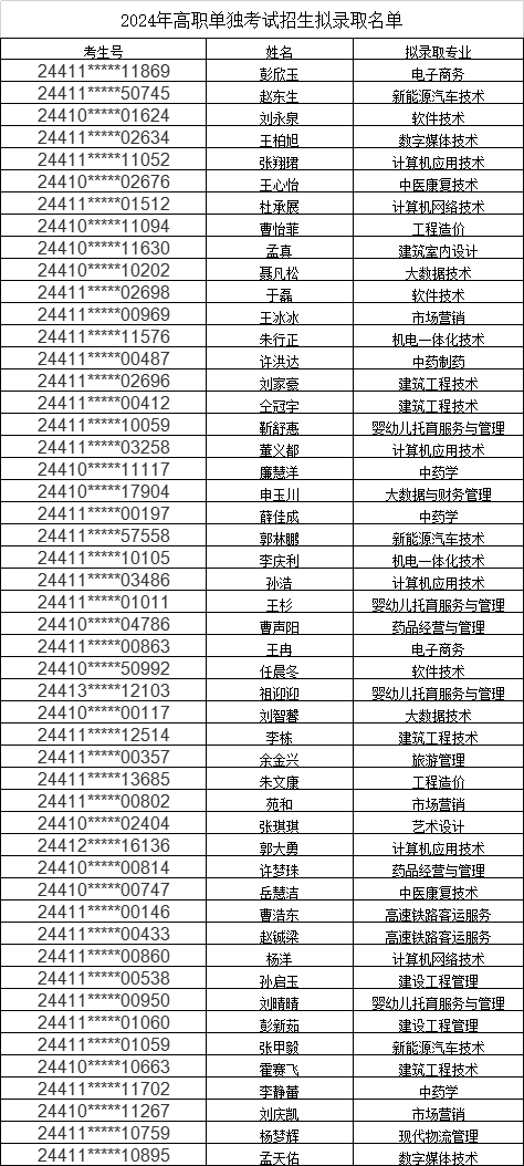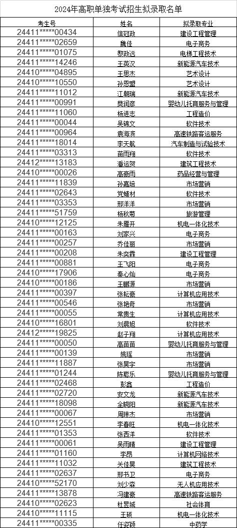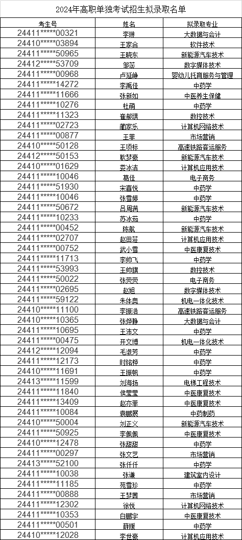 根据《河南省教育厅关于做好2024年高等职业教育单独考试招生和技能拔尖人才免试入学工作的通知》(教学〔2024〕58 号)文件精神,按照我校2024年高职单独考试招生章程有关规定,经学校高职单招工作领导小组审核批准。现将拟录取结果公示如下: