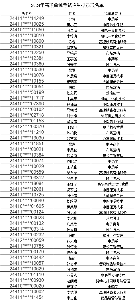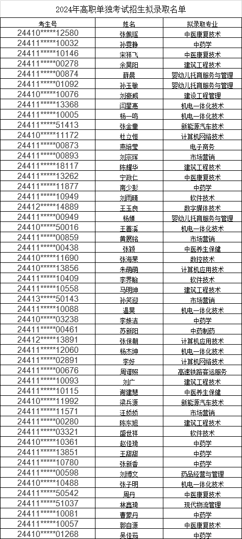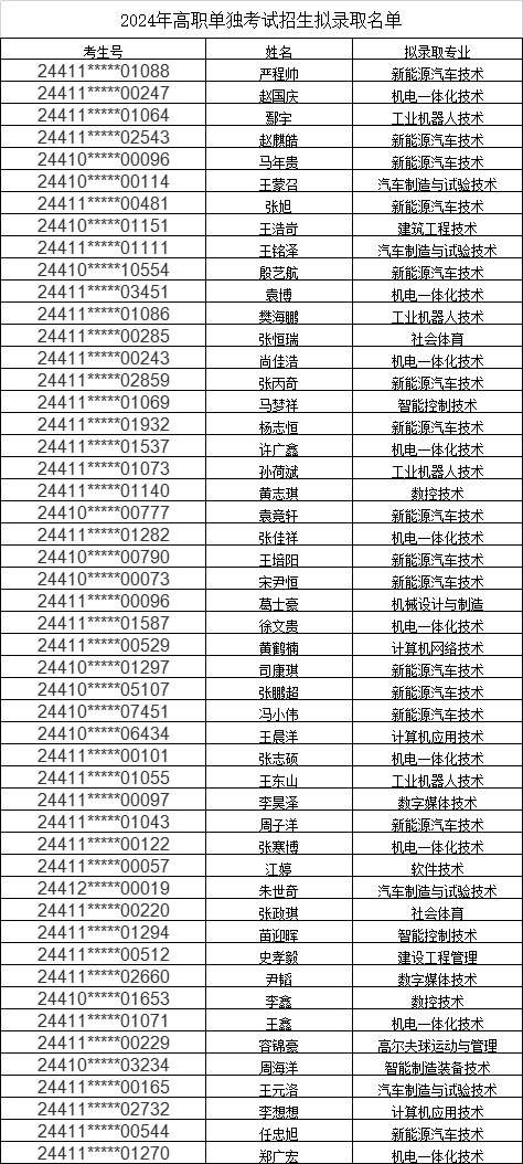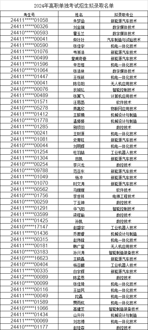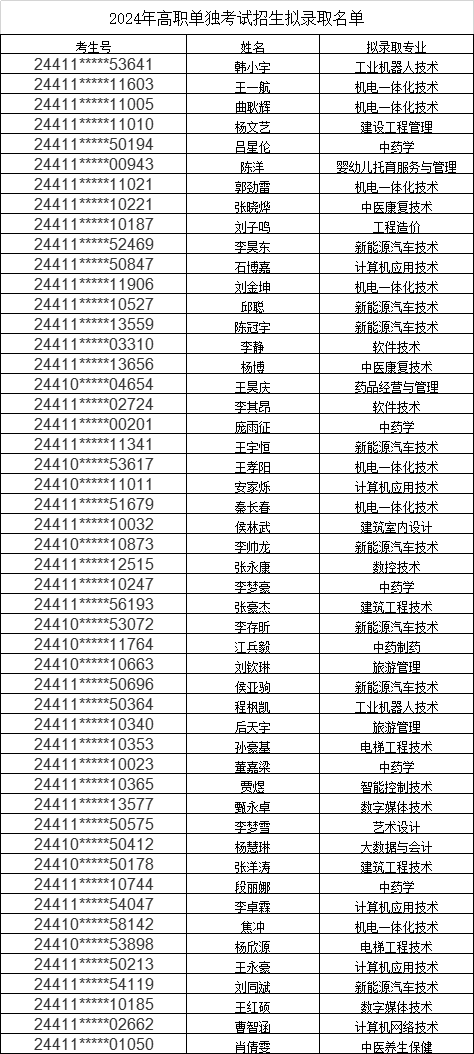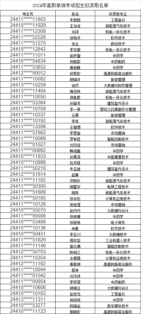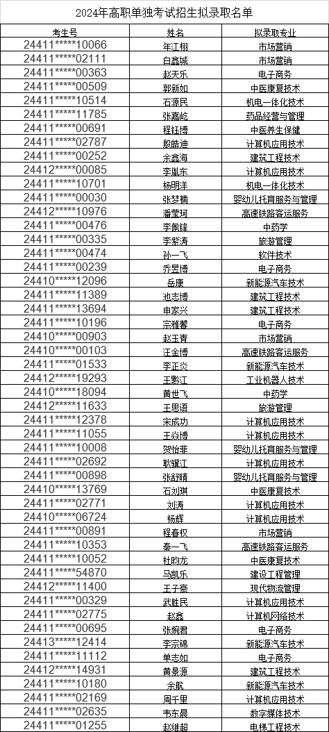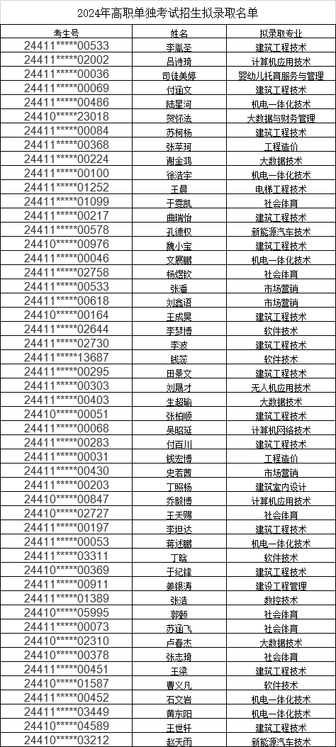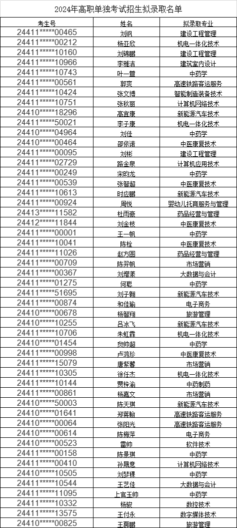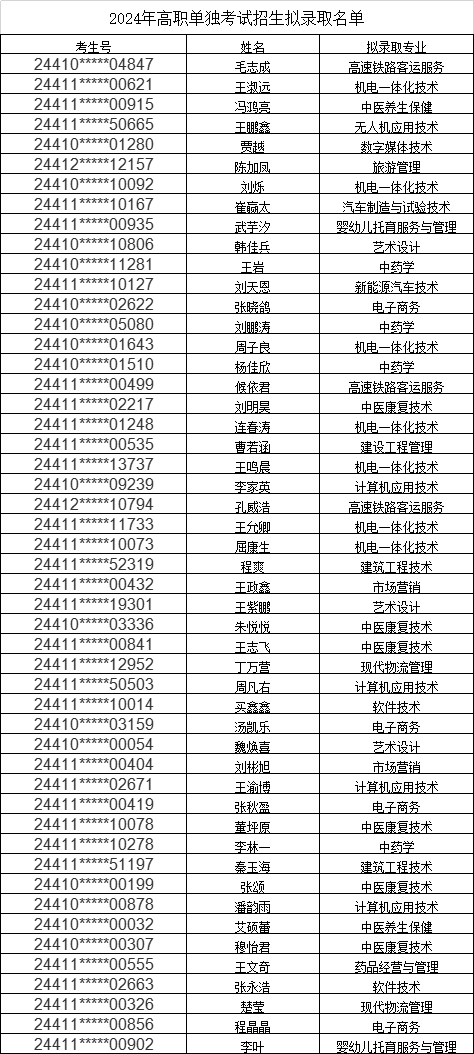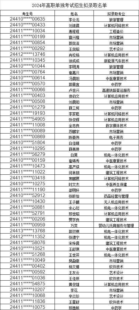 根据《河南省教育厅关于做好2024年高等职业教育单独考试招生和技能拔尖人才免试入学工作的通知》(教学〔2024〕58 号)文件精神,按照我校2024年高职单独考试招生章程有关规定,经学校高职单招工作领导小组审核批准。现将拟录取结果公示如下: