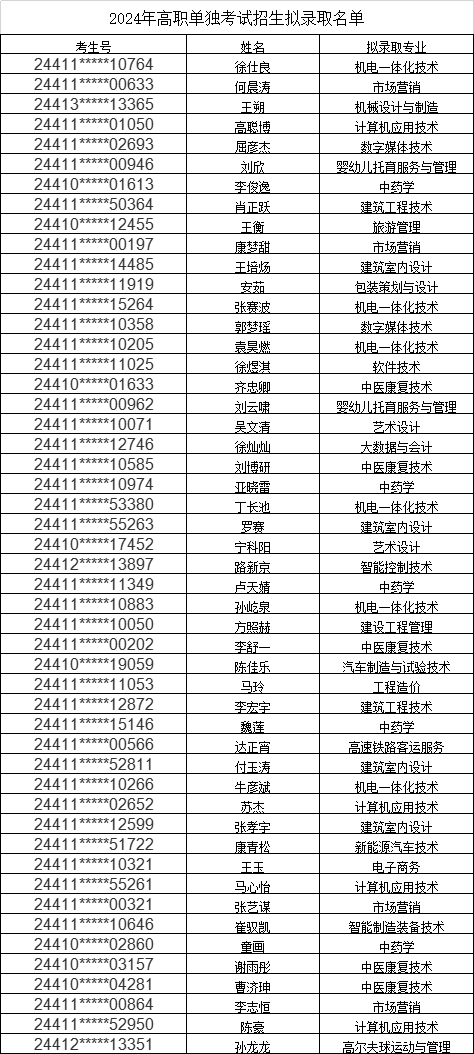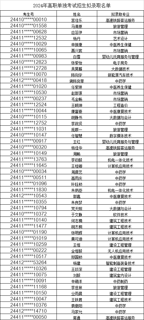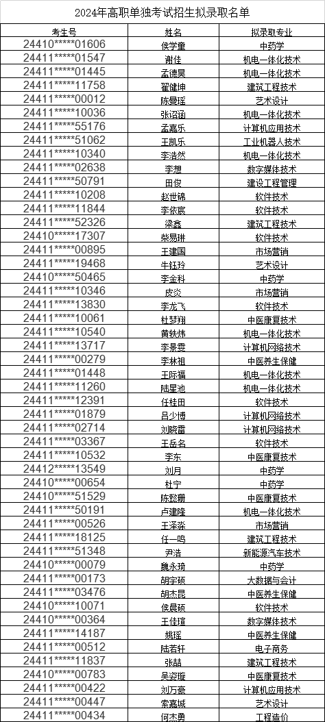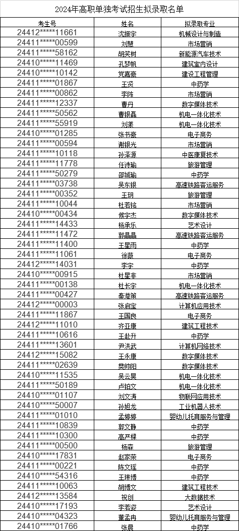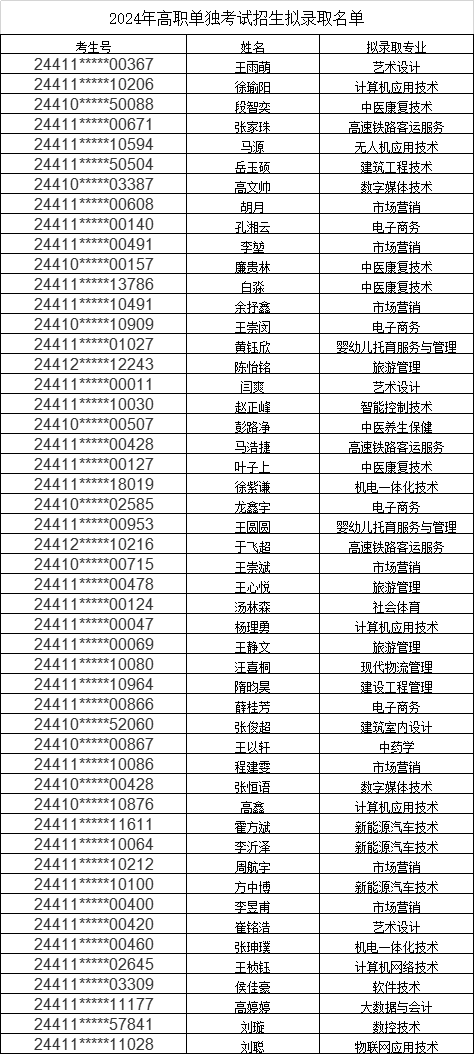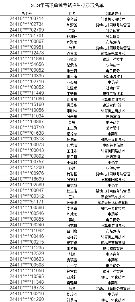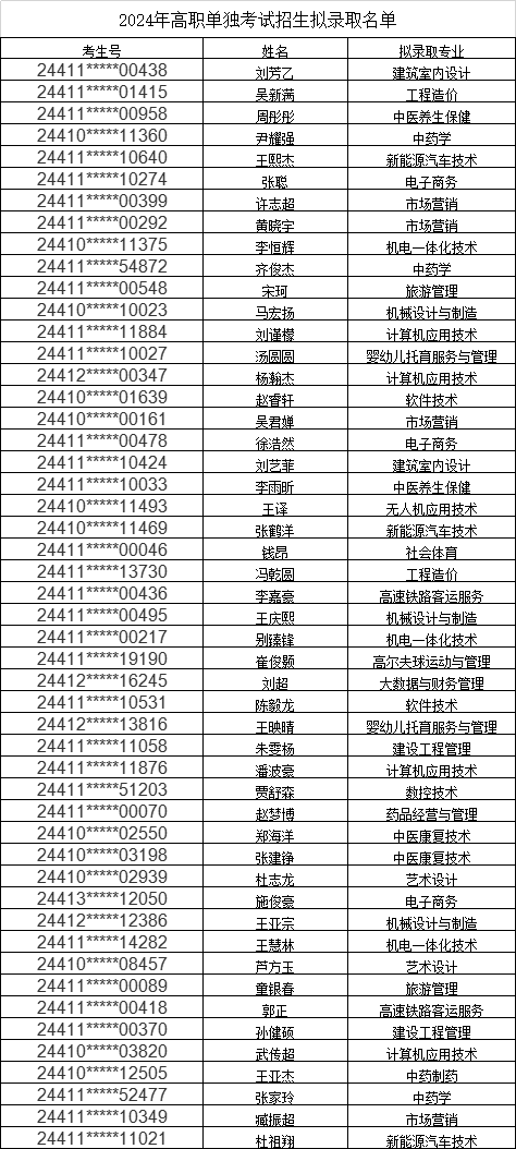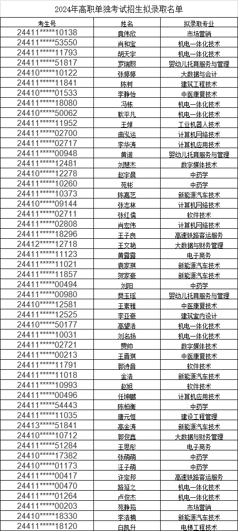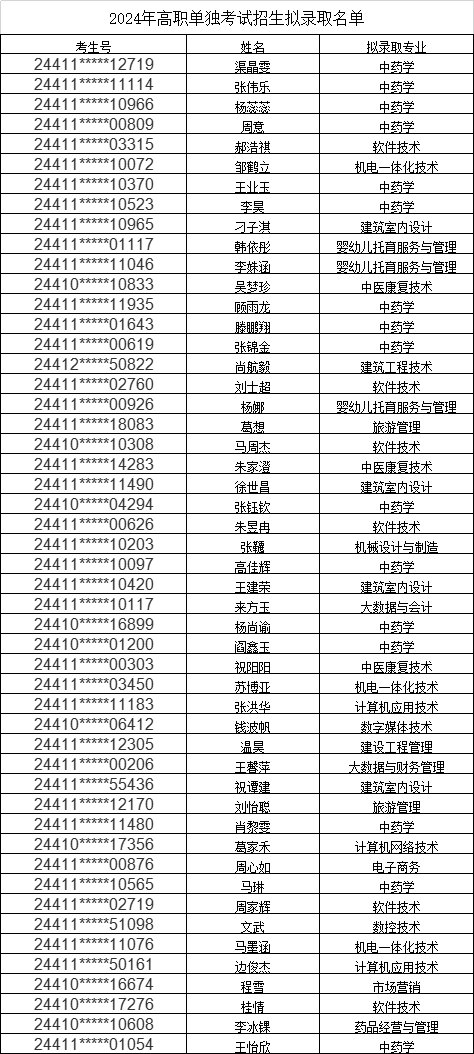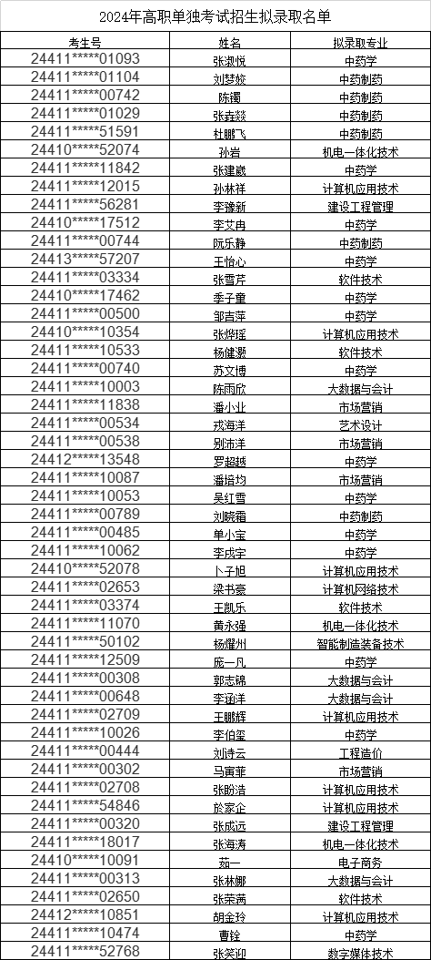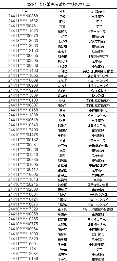 根据《河南省教育厅关于做好2024年高等职业教育单独考试招生和技能拔尖人才免试入学工作的通知》(教学〔2024〕58 号)文件精神,按照我校2024年高职单独考试招生章程有关规定,经学校高职单招工作领导小组审核批准。现将拟录取结果公示如下: