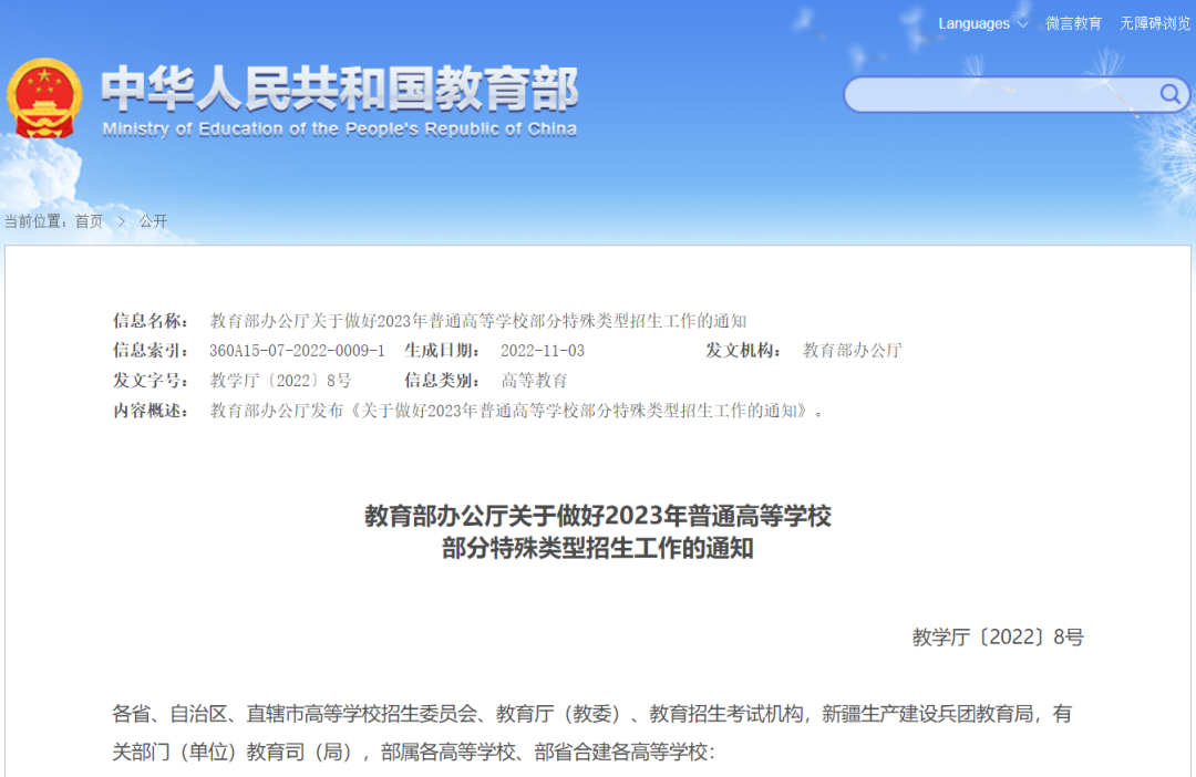 日前,教育部印发通知,对做好2023年普通高校部分特殊类型考试招生工作作出部署。